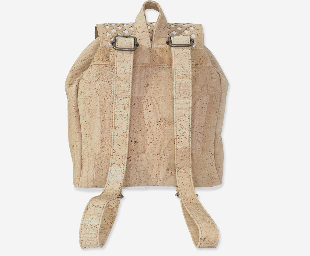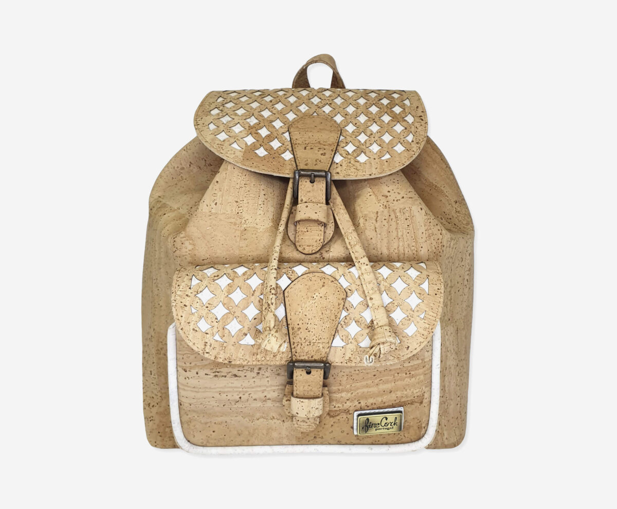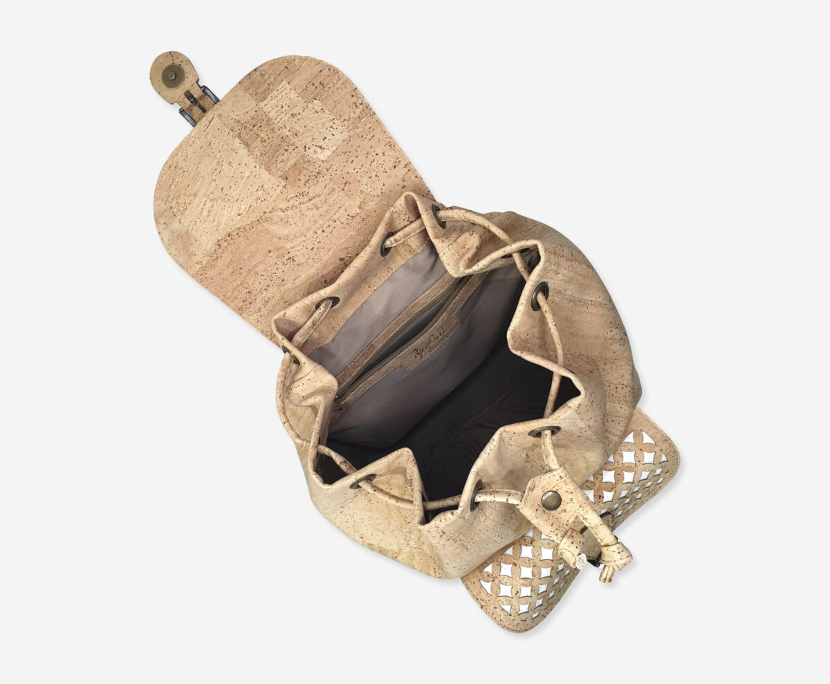 Big Backpack made of genuine cork leather with perforated effect. The backpack has a main compartment with enough space for everything you need and one front poket. It has a grip handle and padded cork shoulder straps for easy portability.Closes on the drawstring, flap and fast magnetic clip closure. Our branded label is on the front.