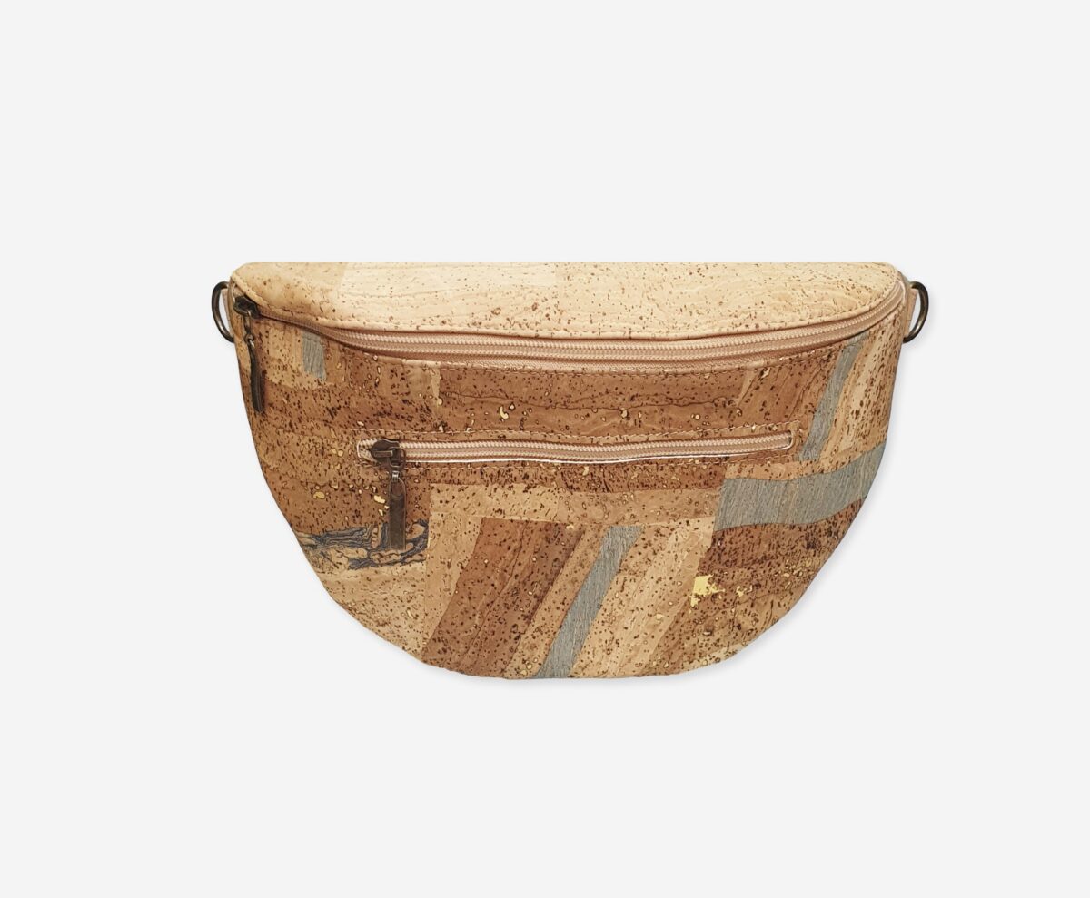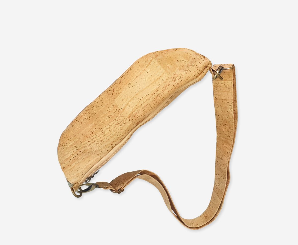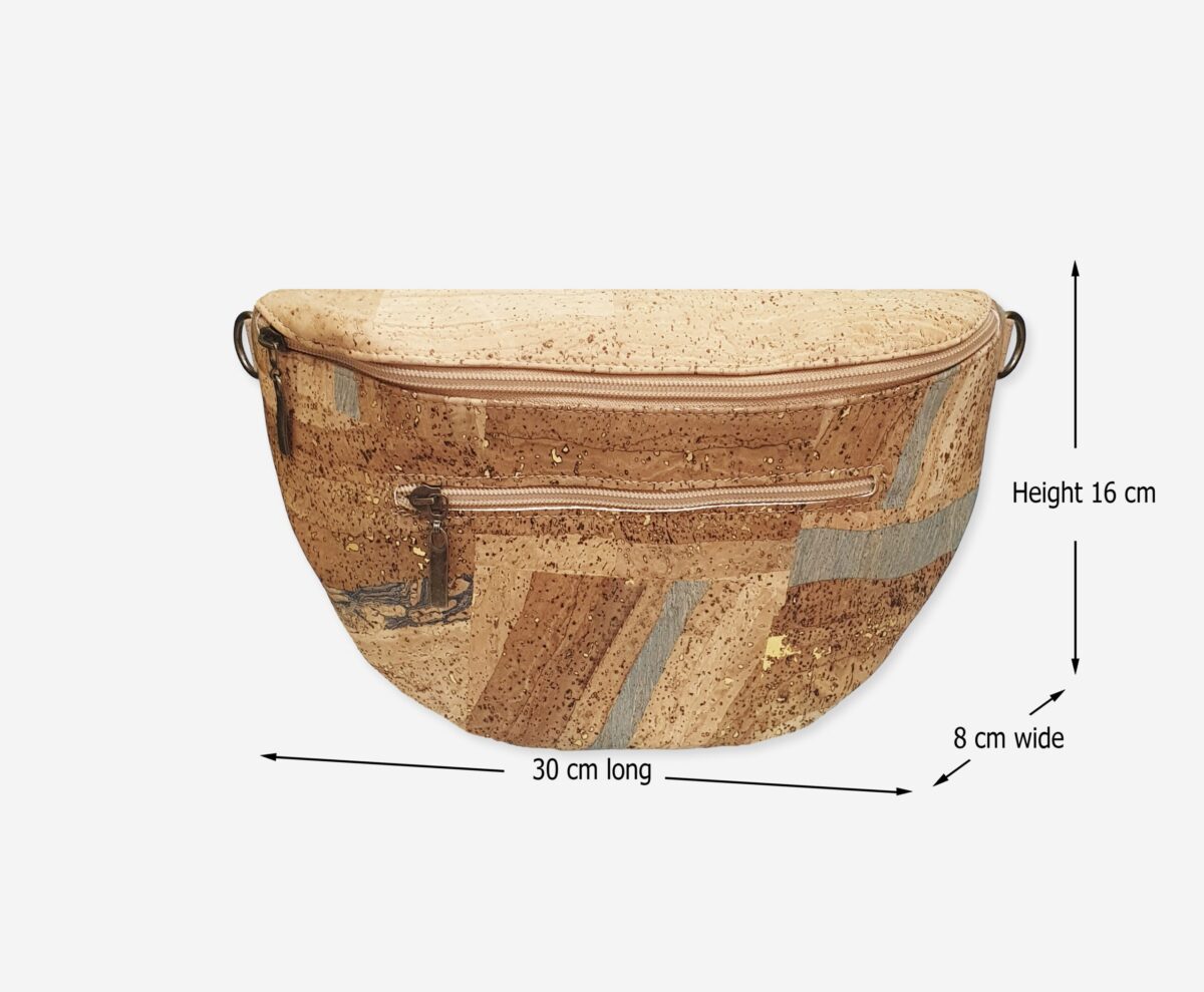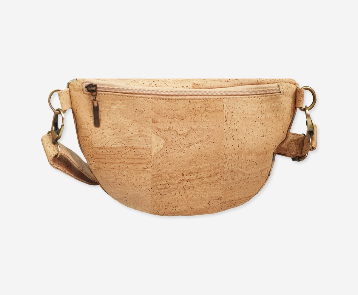 Belt or waist bag made with high quality cork with zip packet on the front. This is a waist bag  has detachable and adjustable strap that allows the bag to be worn on the shoulder, crossbody, or as a waist bag, adding versatility and convenience. Handy front pocket for quick access to essentials like your phone, keys, or cards. Modern and stylish design suitable for everyday use as well as special occasions. The natural cork gives the bag a unique look and texture.