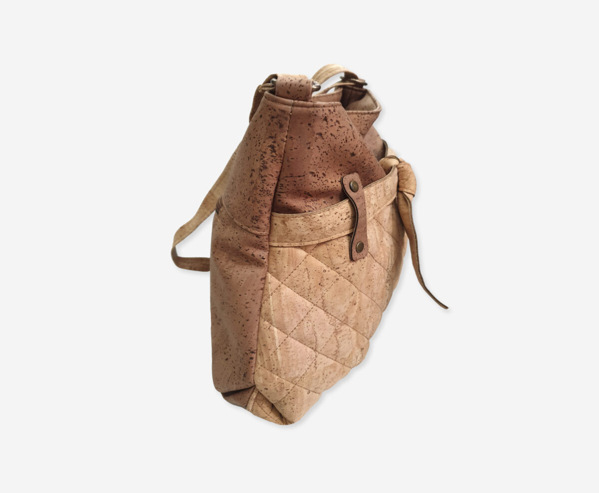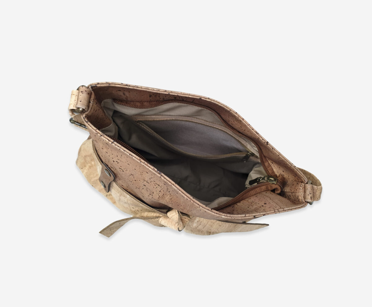 Stylish Brown Shoulder Bag with higth quality cork. There is decorative bow the outside. Bag has a long adjustable shoulder strap and can be worn on the shoulder or over the shoulder. In front there is a our branded label.
