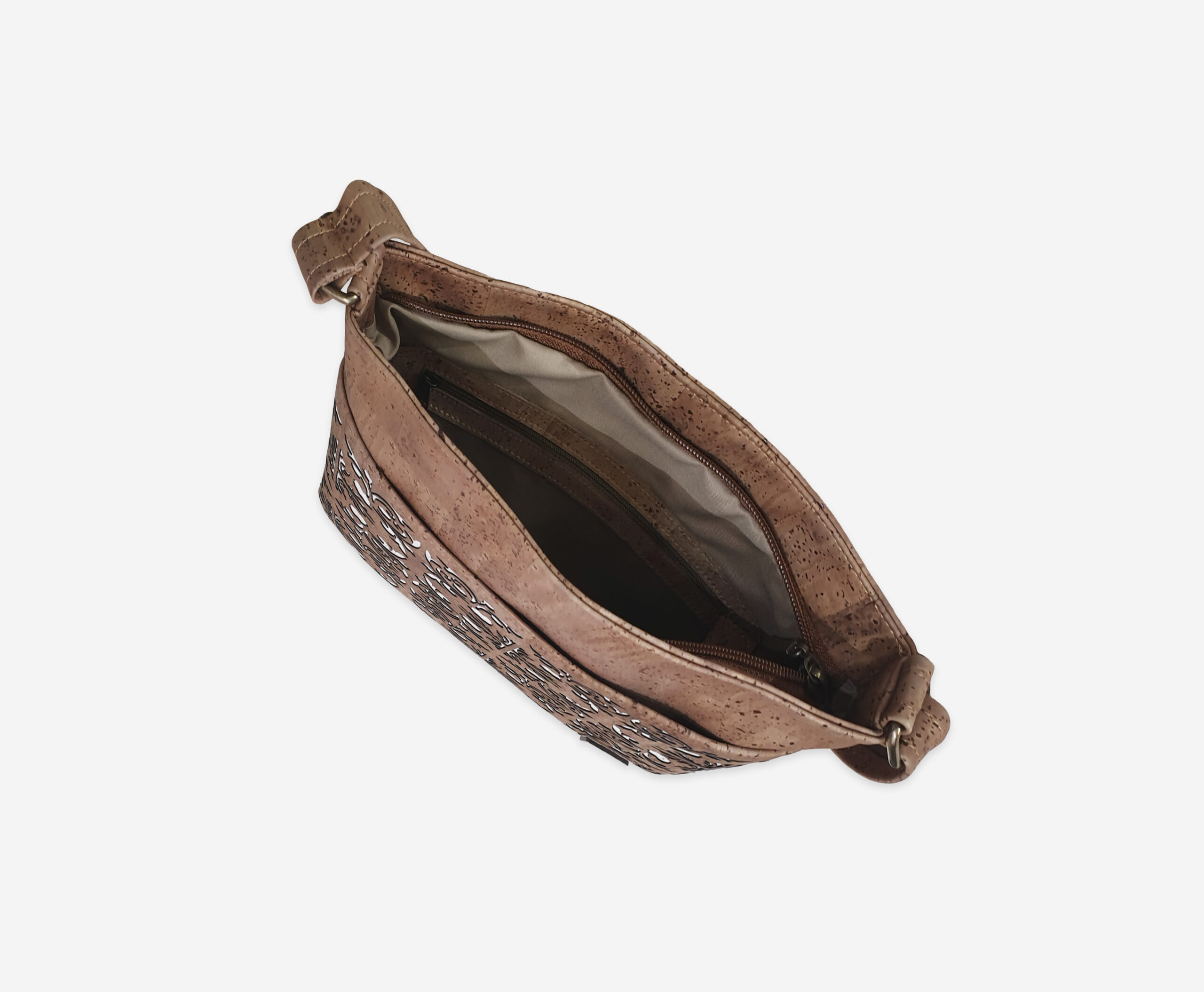 The Shoulder Bag made with high quality cork many colors with perforated effect. There is have decorative pattern represents the famous portugues filigrin cut on cork. Bag closes with a zipper on the top. Also bag has large pocket on the front closes magnet clap. Has adjustable shoulder strap and bag can be worn over the shoulder or on the shoulder.In front there is a our branded label.