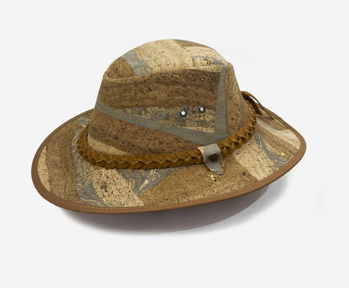 Real Cork and Leather Cowboy Hat make with high quality cork and genuine leather. Hat features a small brim which is reinforced with a flexible to allow this hat to be crushed if needed for travel. It it designed with a snap on each side which allows for a band or scarf of your choice