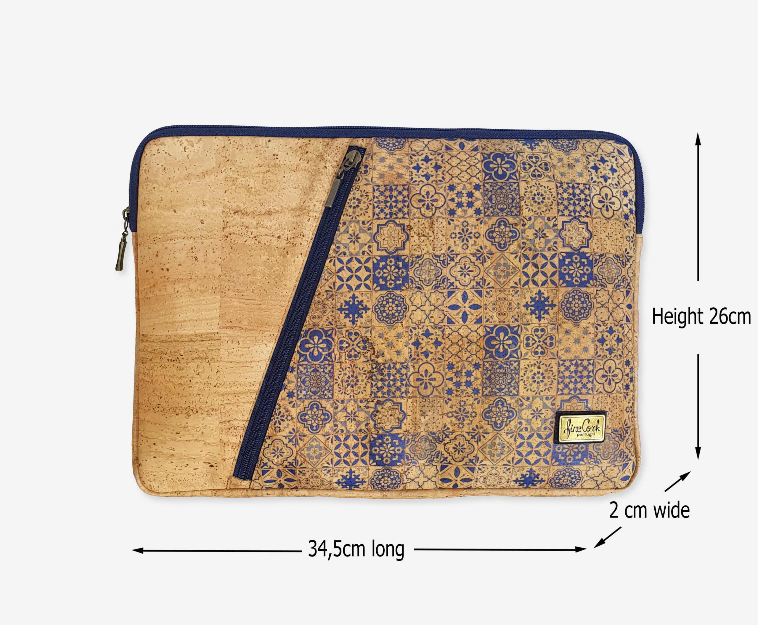 The 12-13″ inches compact sleeve beautifully complements form of your MacBook/Laptop, made of genuine cork leather with print. While its plush lining helps prevent scratches and bumps. The laptop sleeve closes with zipper and additional front panel accessory pocket. Our branded label is on the front.