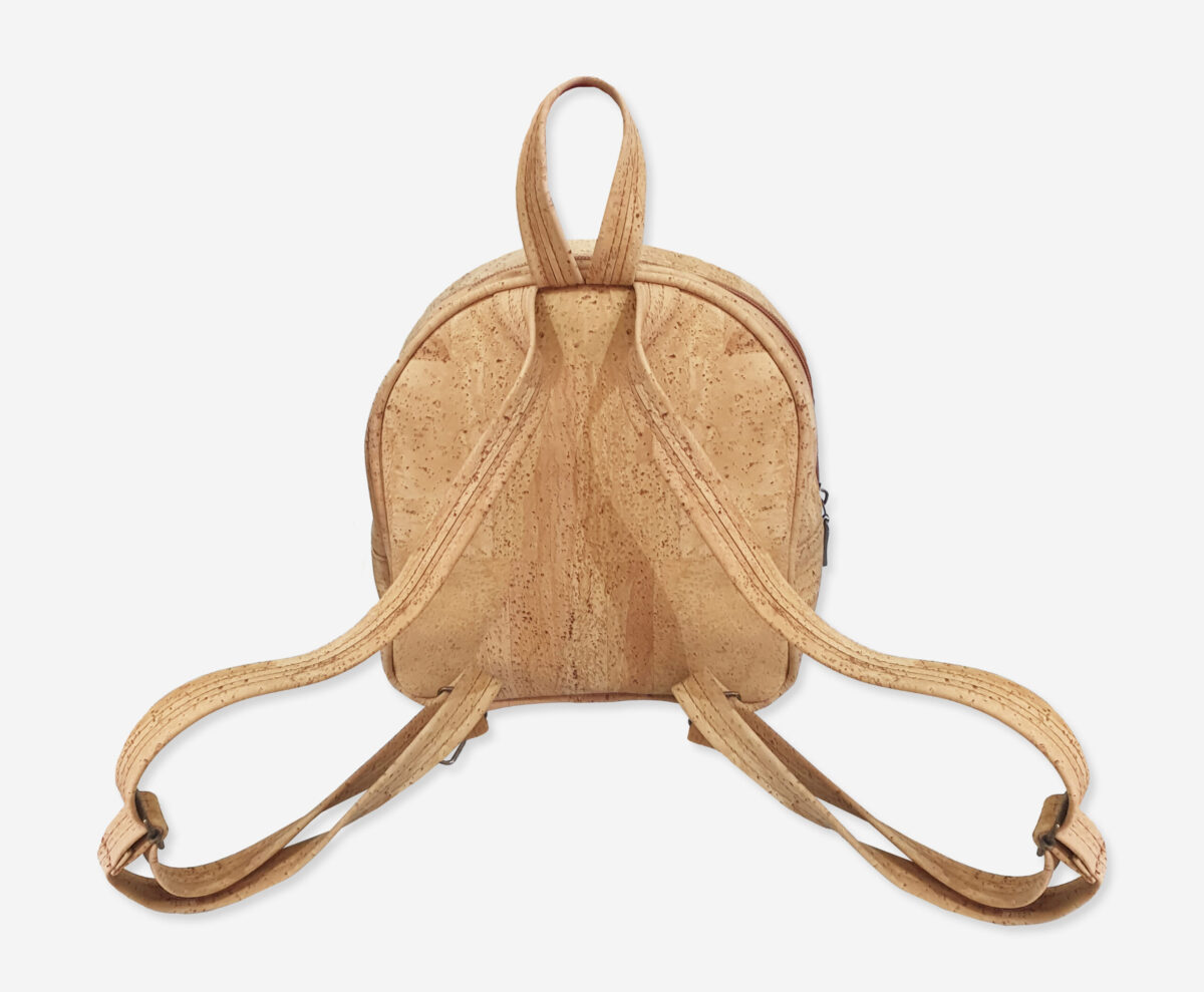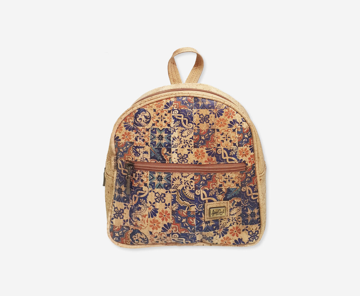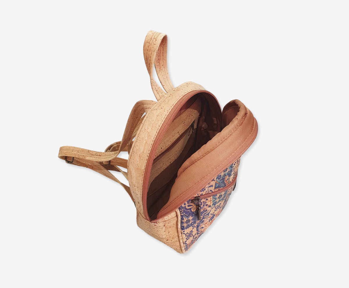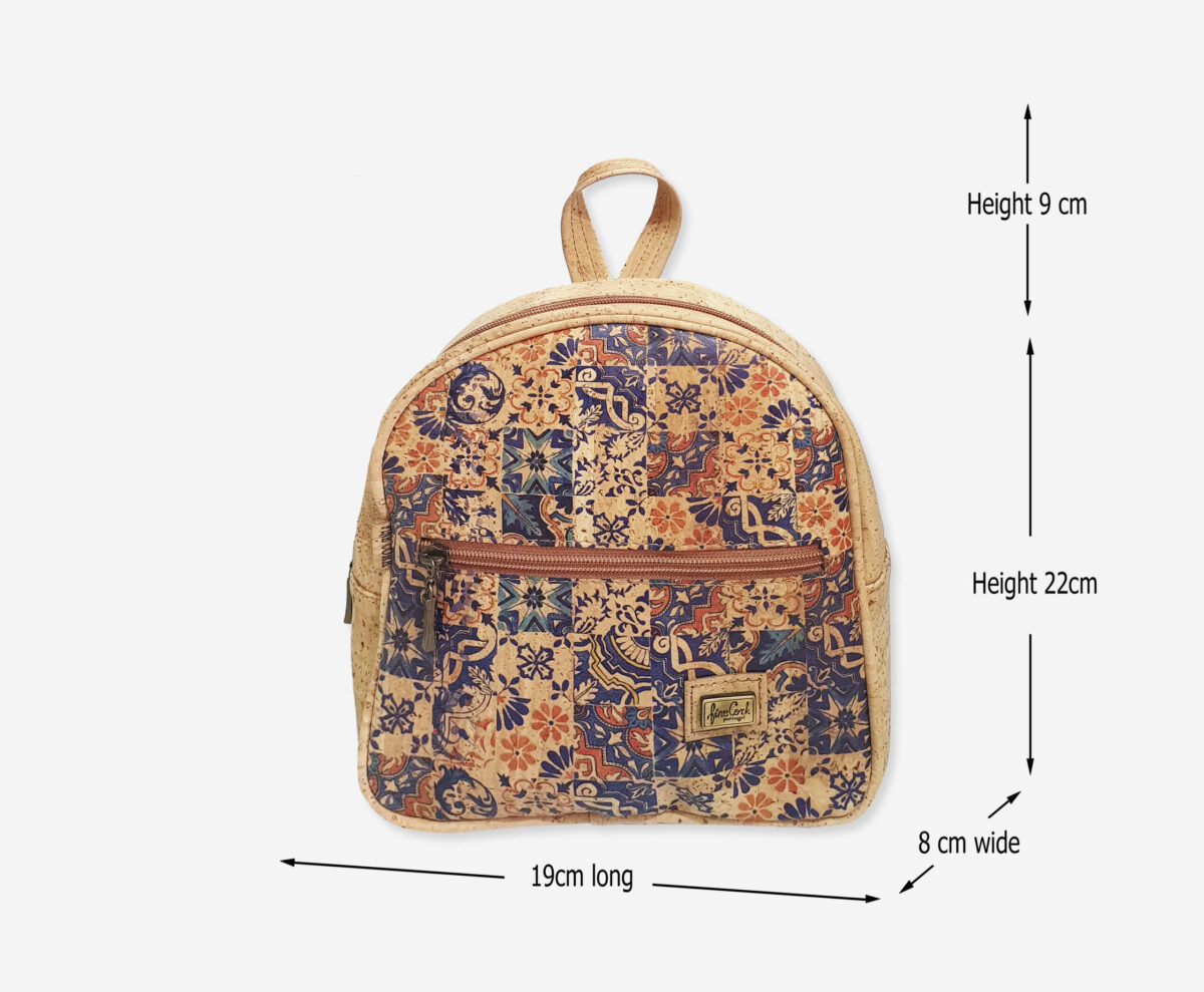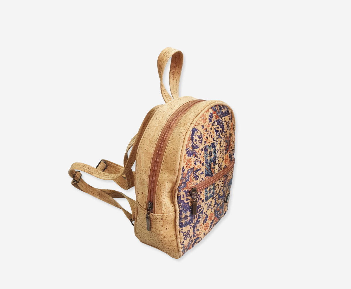 Small Backpack made of genuine cork leather with print. The backpack has a one main zip compartment and one front slip compartment with enough space for everything you need. It has a grip handle and padded cork shoulder straps for easy portability.