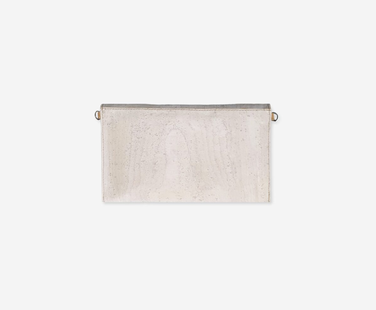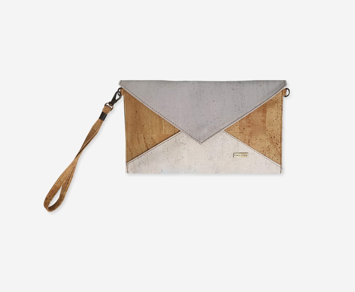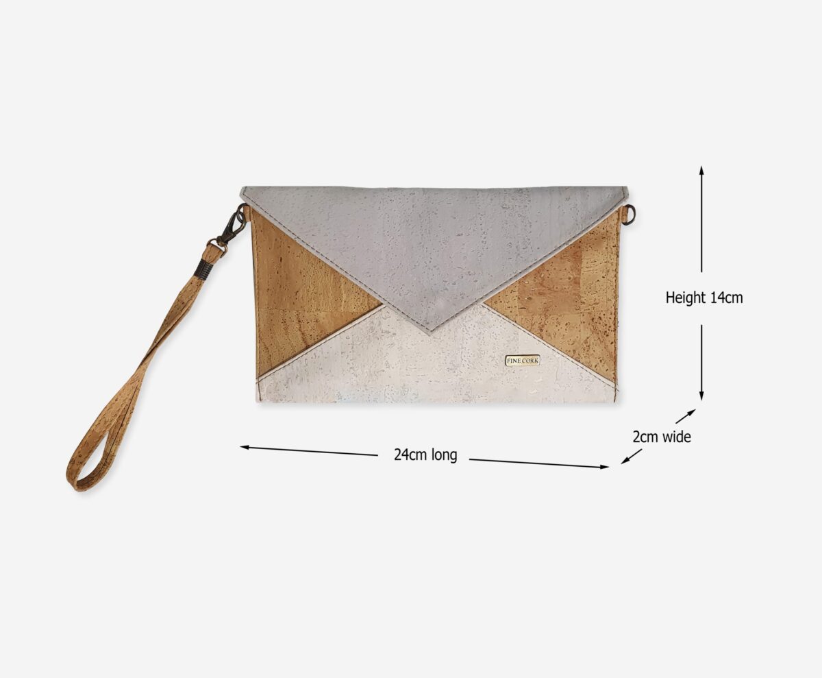 This clutch bag is crafted from colorful cork material, offering a distinct and natural look. The design features a combination of beige, brown, and light gray shades arranged in a geometric pattern, giving it a stylish and modern appearance. The bag has a triangular flap closure, adding to its sophisticated aesthetic. It includes a detachable wrist strap, allowing for versatile carrying options and removable wrist strap, providing a convenient carrying option. The compact and elegant design makes it perfect for both casual outings and formal events.