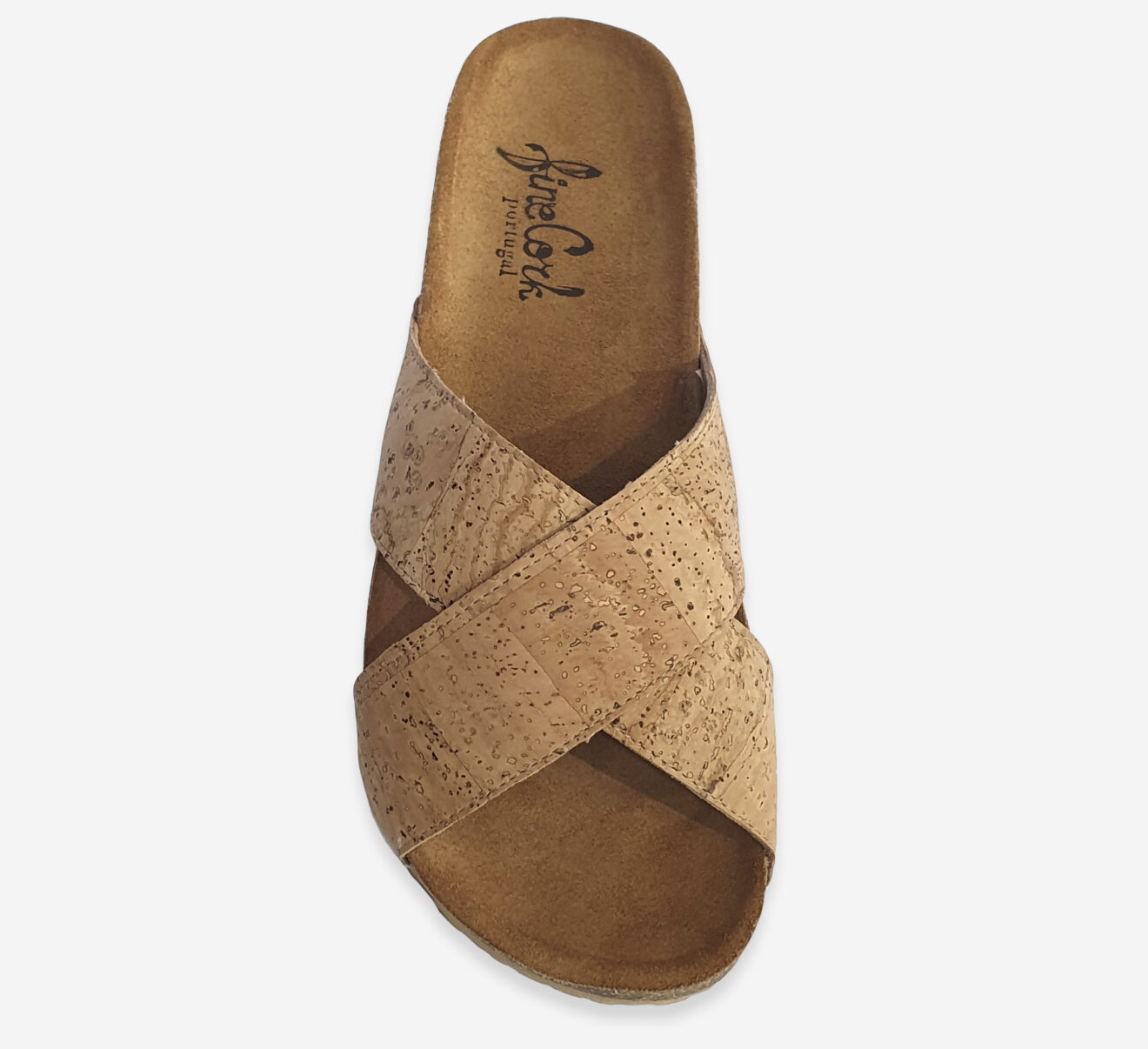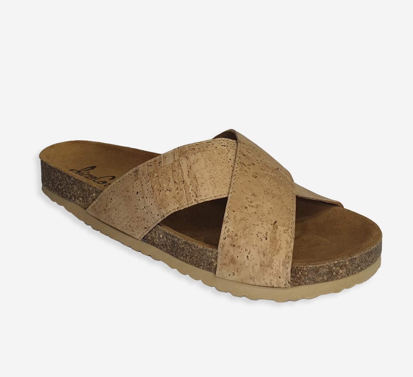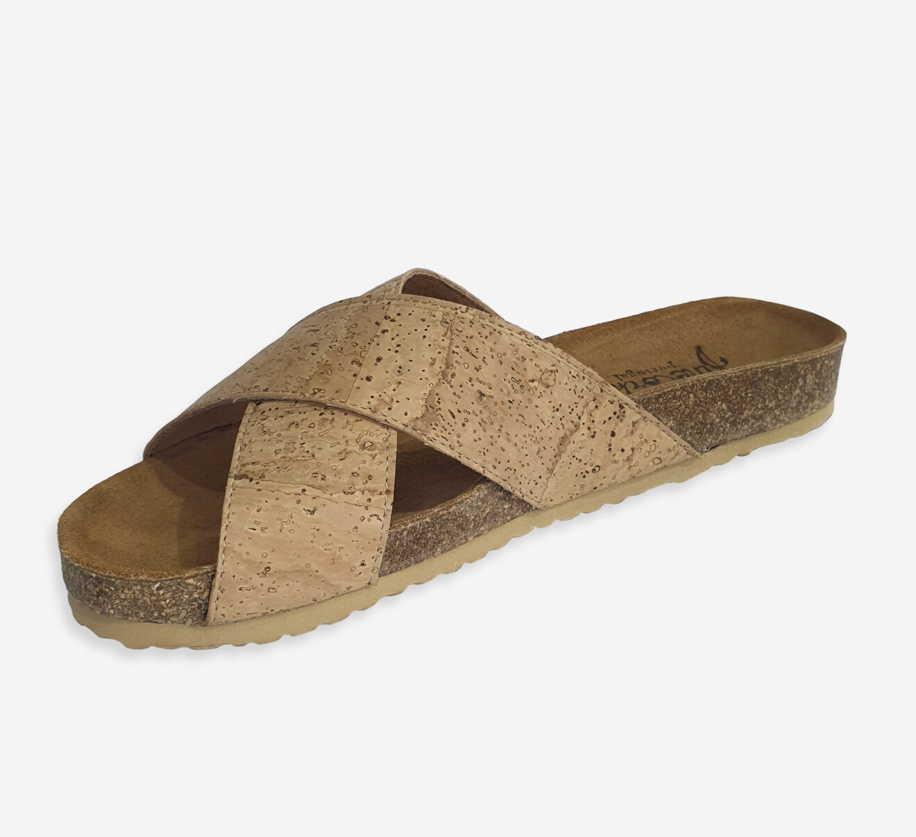 Natural comfort with a timeless look. These slides feature an anatomical cork sole and soft leather insole for all-day support. The crossed upper straps, made from cork and leather, gently secure the foot. A versatile, classic-inspired design — perfect for everyday wear and travel.