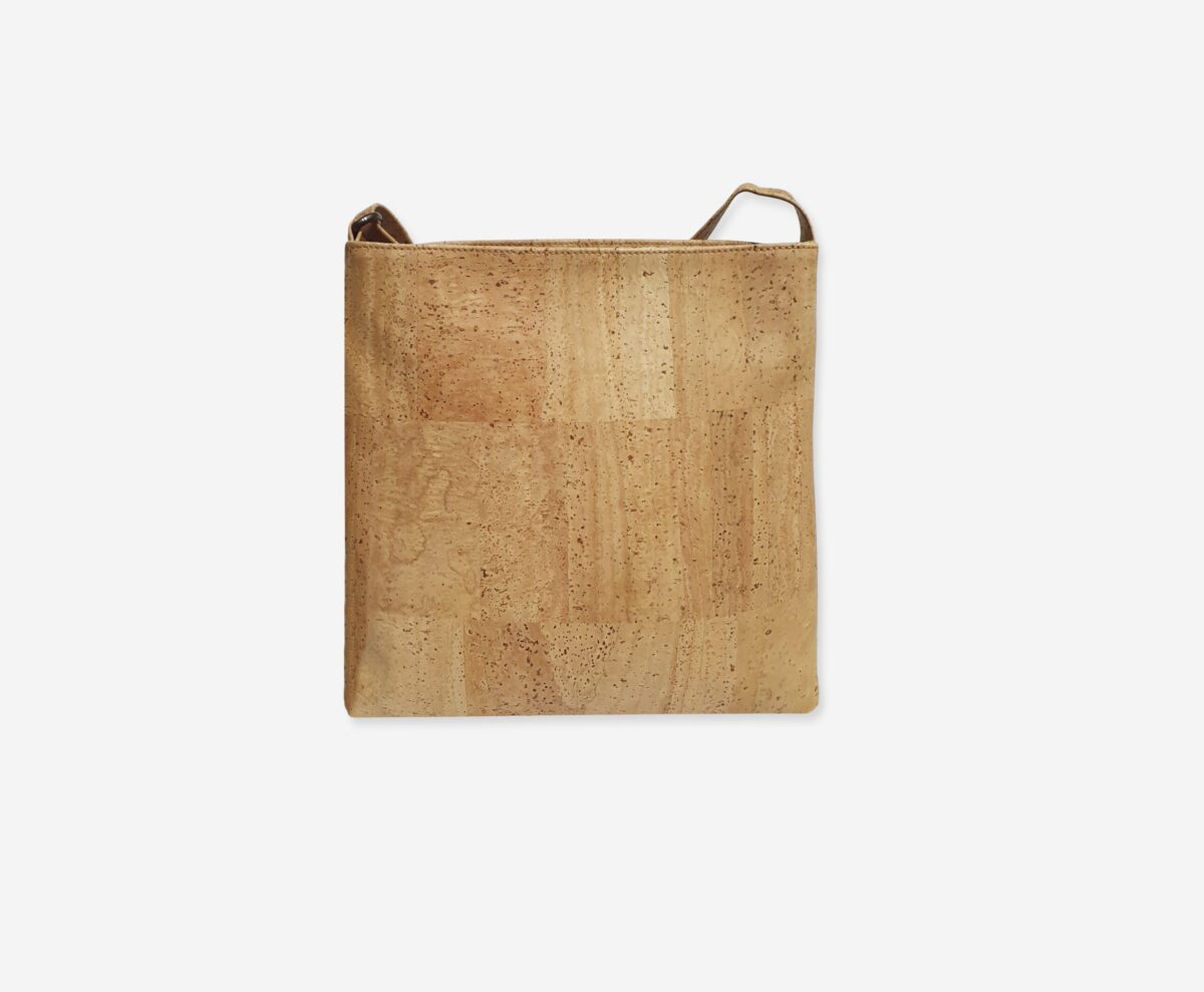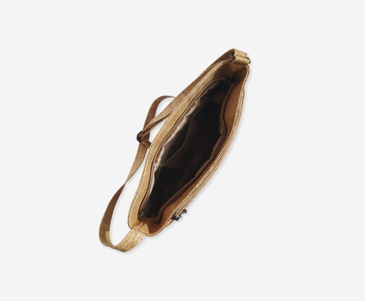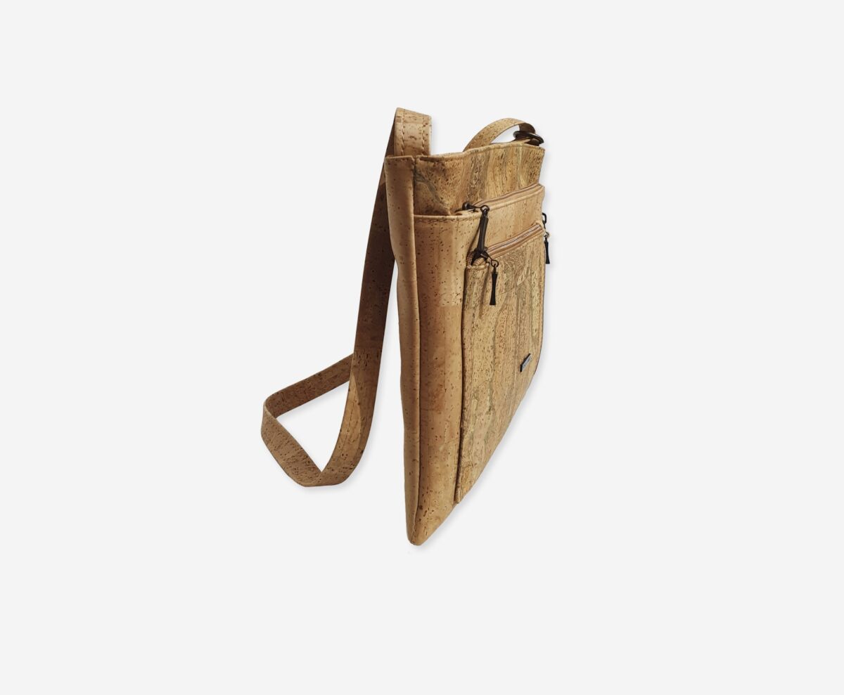 Vegan Cork Shoulder Bag with higth quality cork. The bag has a flap that closes with a zipper on the top and two pockest of the front closes with a zipped. The bag have a long adjustable shoulder strap and can be worn on the shoulder or over the shoulder. In front there is a our branded label.