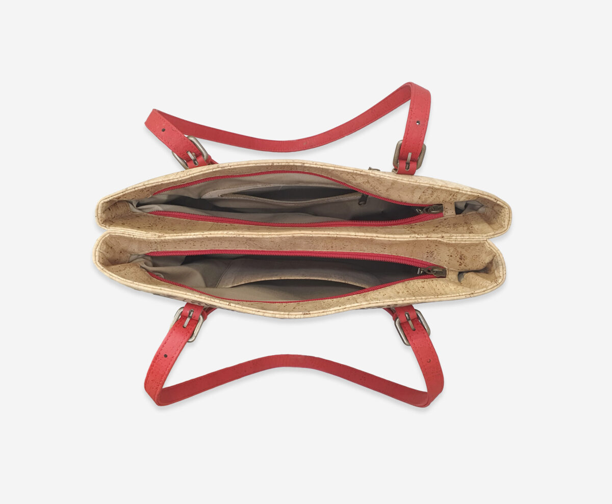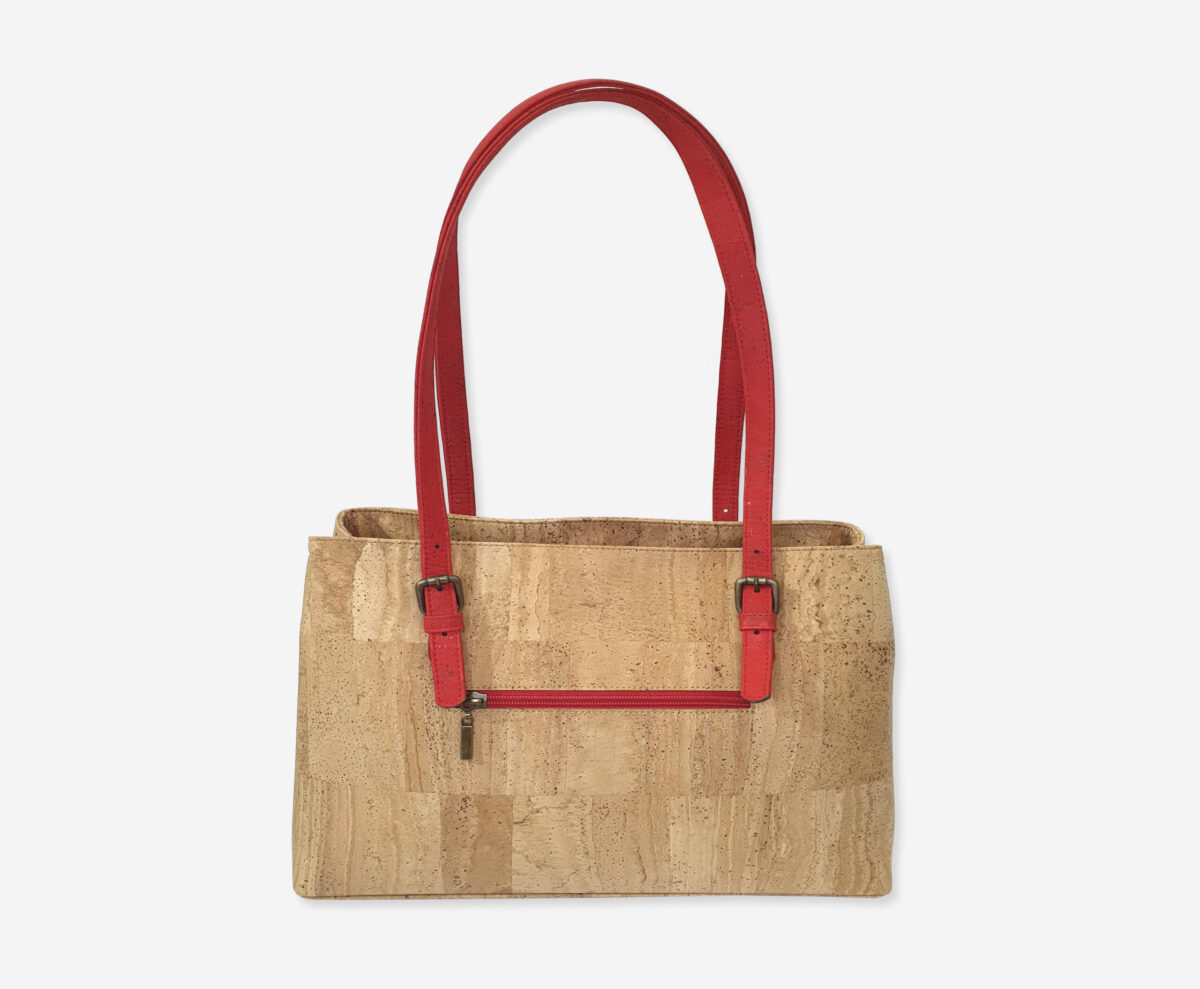 Large Handbag with high quality cork has a softly structured shape and a zipper closure.There is have decorative pattern represents the famous portugues filigrin cut on cork. There is protective metal feet.
