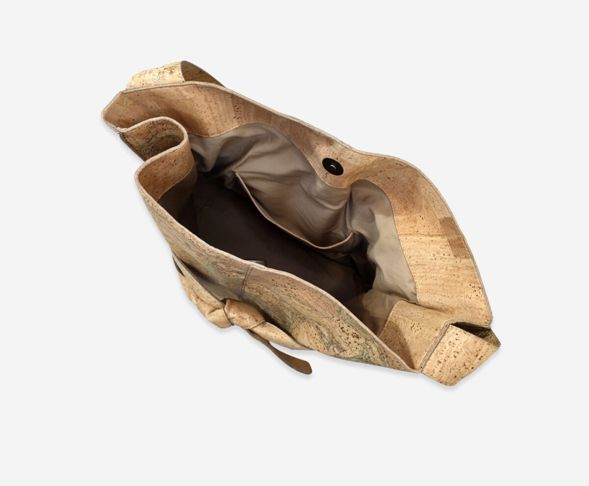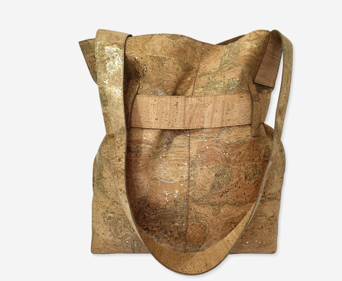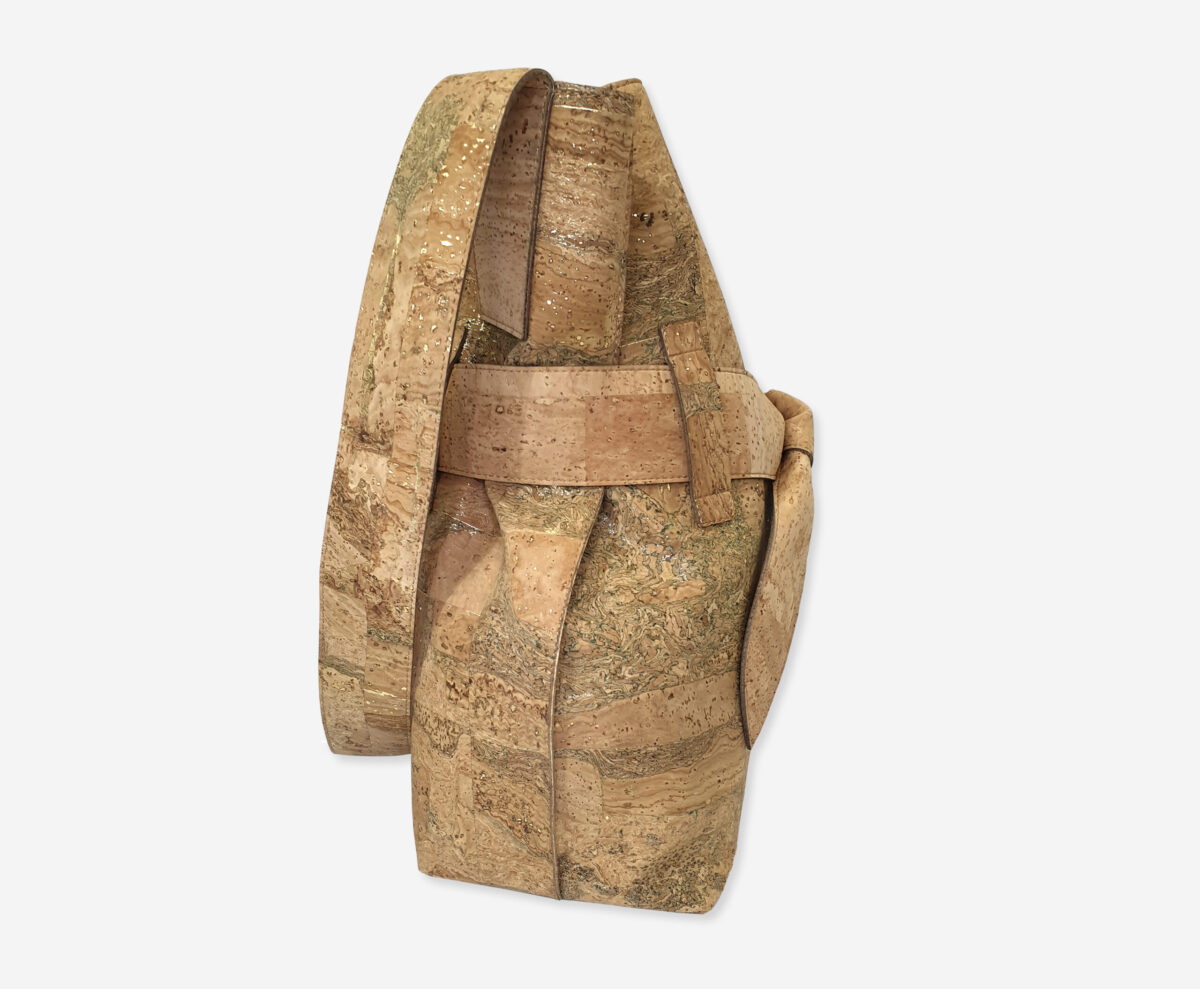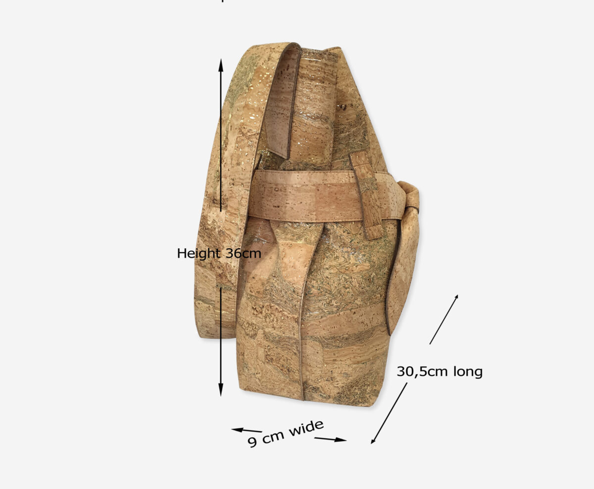 Large Gold Bag with high quality cork. The bag there is one main compartmen with enough space for everything you need. As a decor has sweet bow the outside with natural color cork. There is a long adjustable shoulder strap what can be worn on the shoulder. In front there is a our branded label.