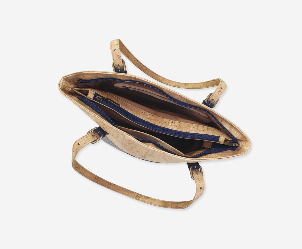 Handbag with high quality cork has a softly structured shape and a zipper closure.The tote is big enough to keep 13″ laptop.There is protective metal feet. External zip pocket for phone or passport. The bag also heve 3 main compartment where you can put enough things there whenever you go out. Inside bag there is small zip pocket and pocket without zipper. In front there is a our branded label.