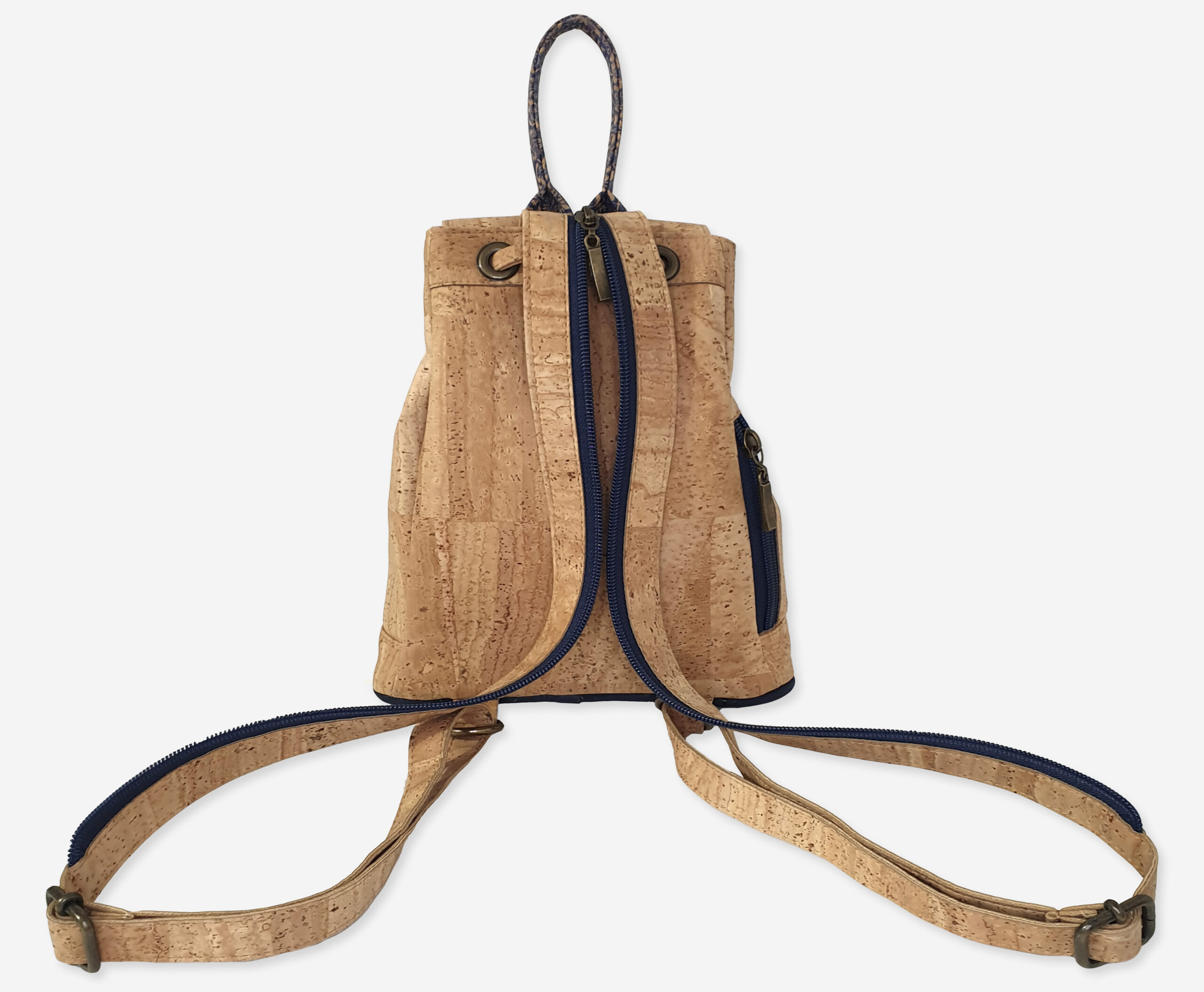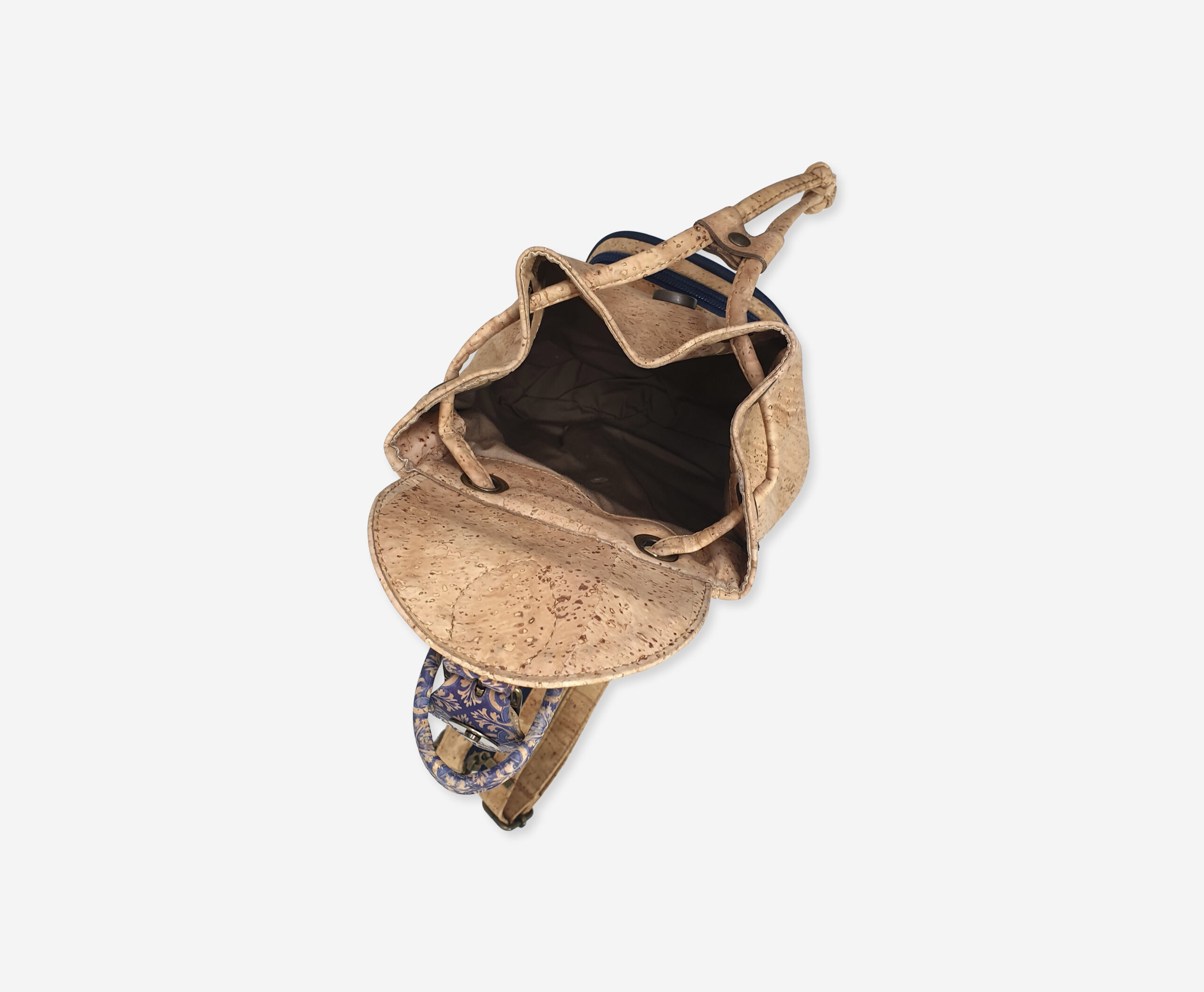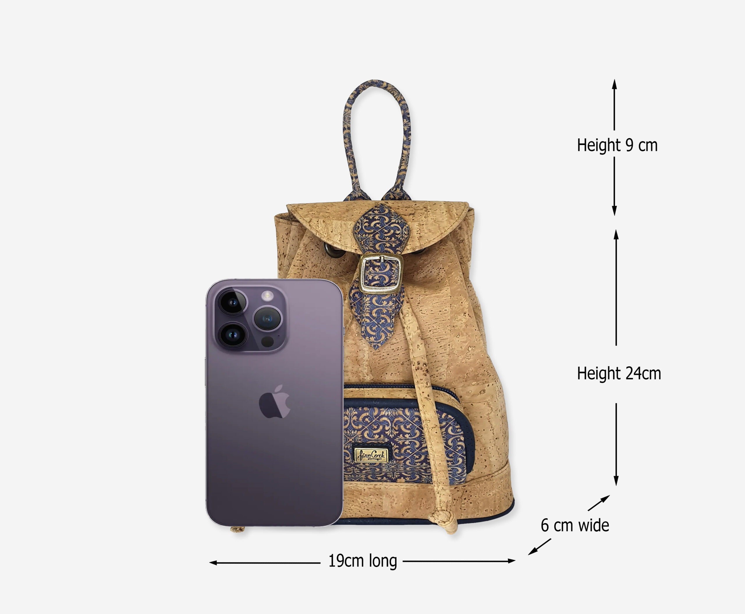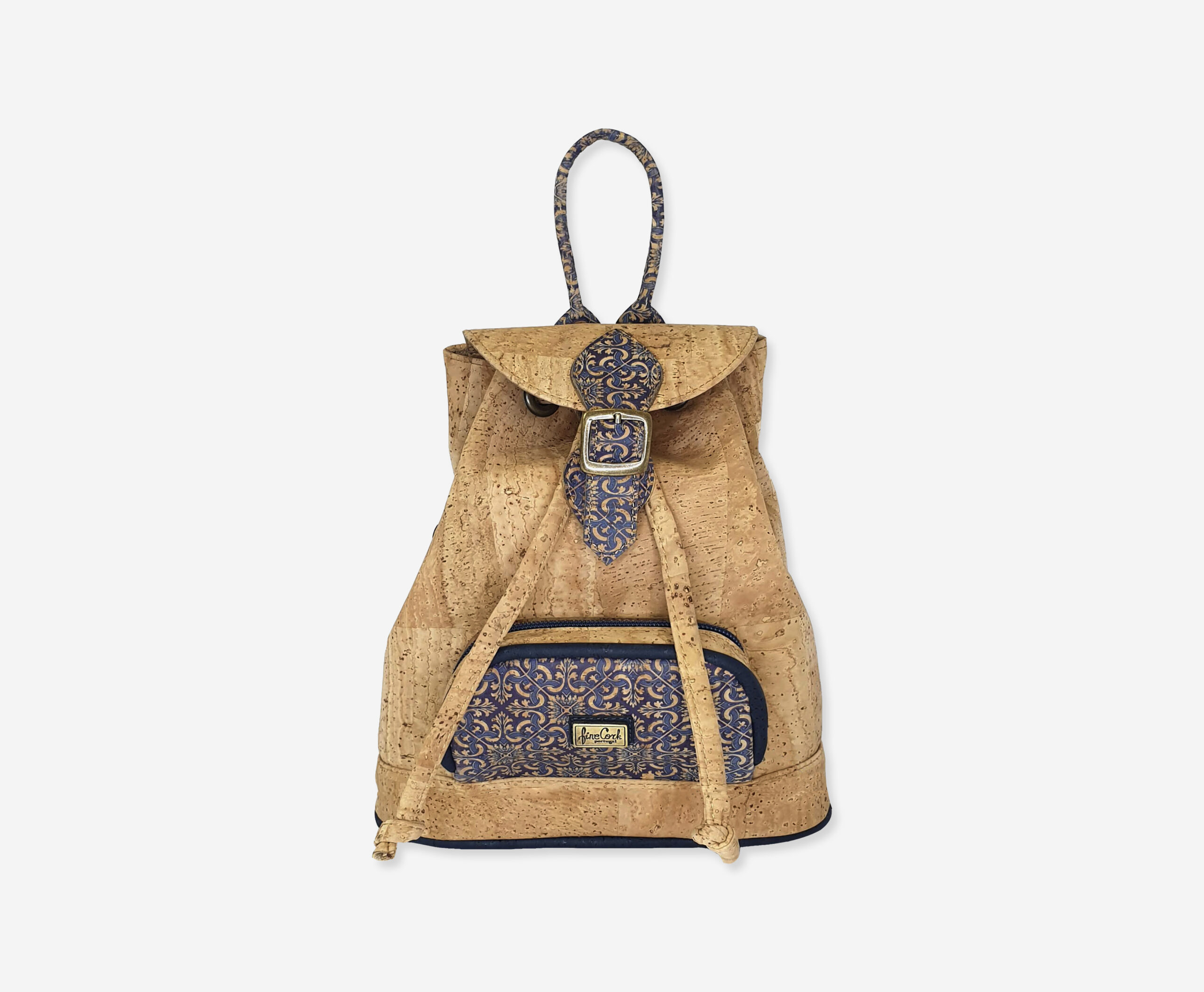 Small backpack made of genuine cork leather with print. Closes on the drawstring, flap and fast magnetic clip closure. The backpack has one zippered compartment from the side and one zip pocket on the front for everything what you need. It has a grip handle and padded cork shoulder straps for easy portability.Can be worn on one shoulder, like backpacks like a handbag.Our branded label is on the front.