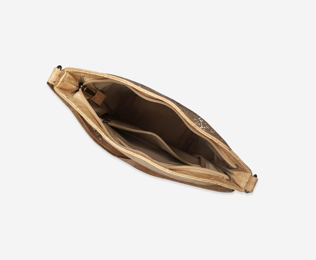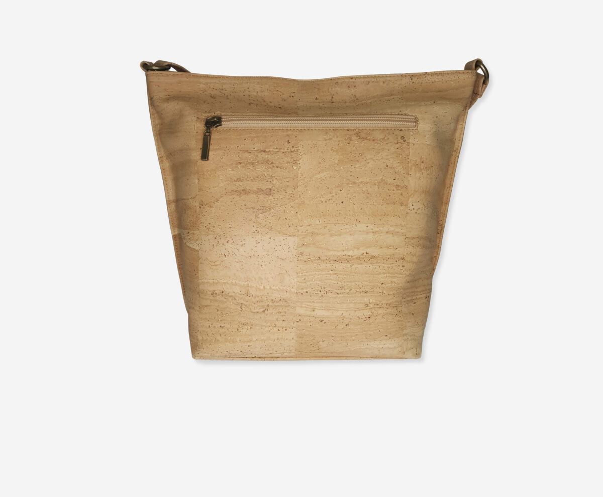 Crossbody Bag with high quality cork. The bag has one main compartment and closes with a zipper on the top. There is a two top long handles and bag can be worn on the shoulder or over the shoulder. In front there is a our branded label.