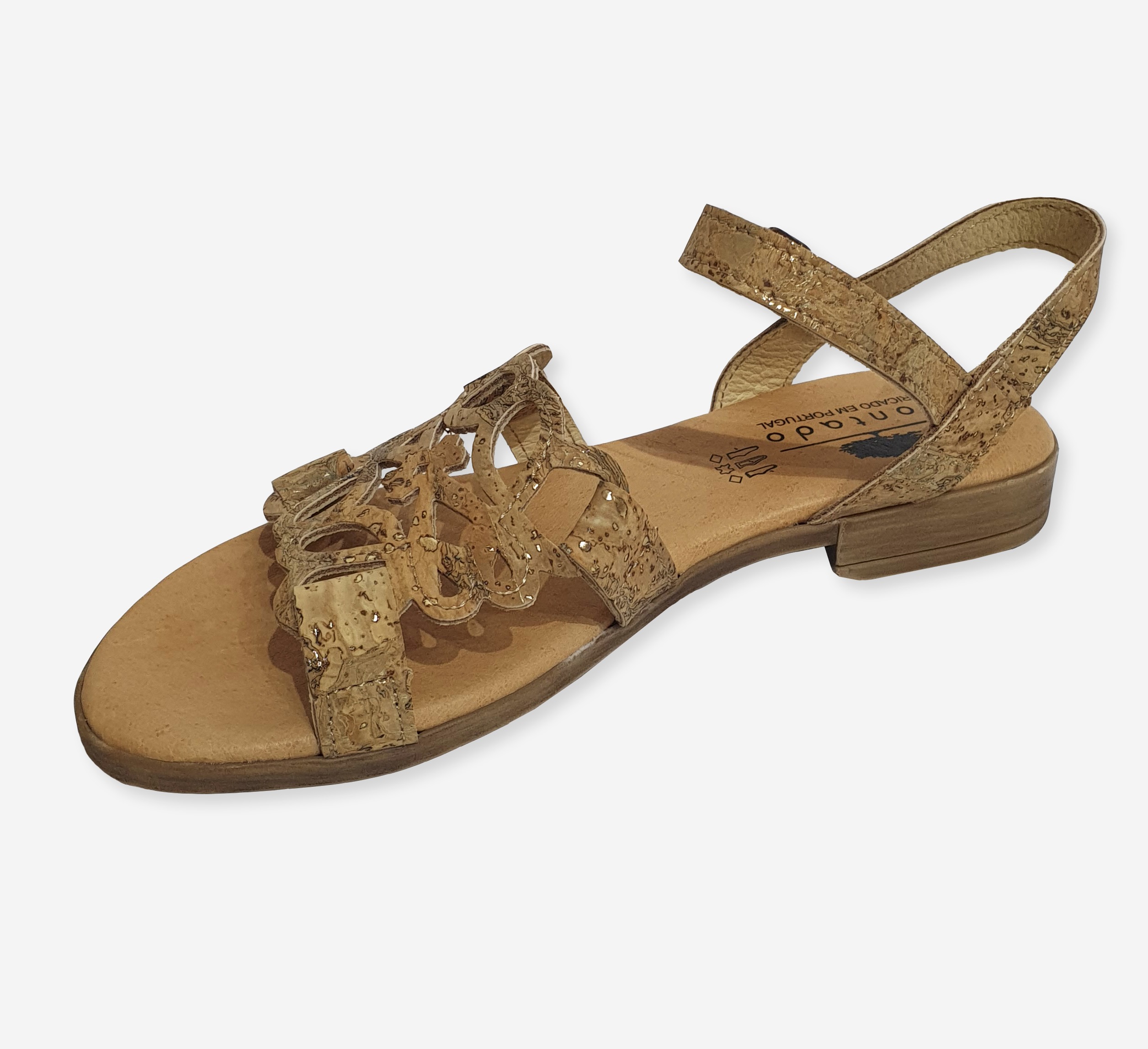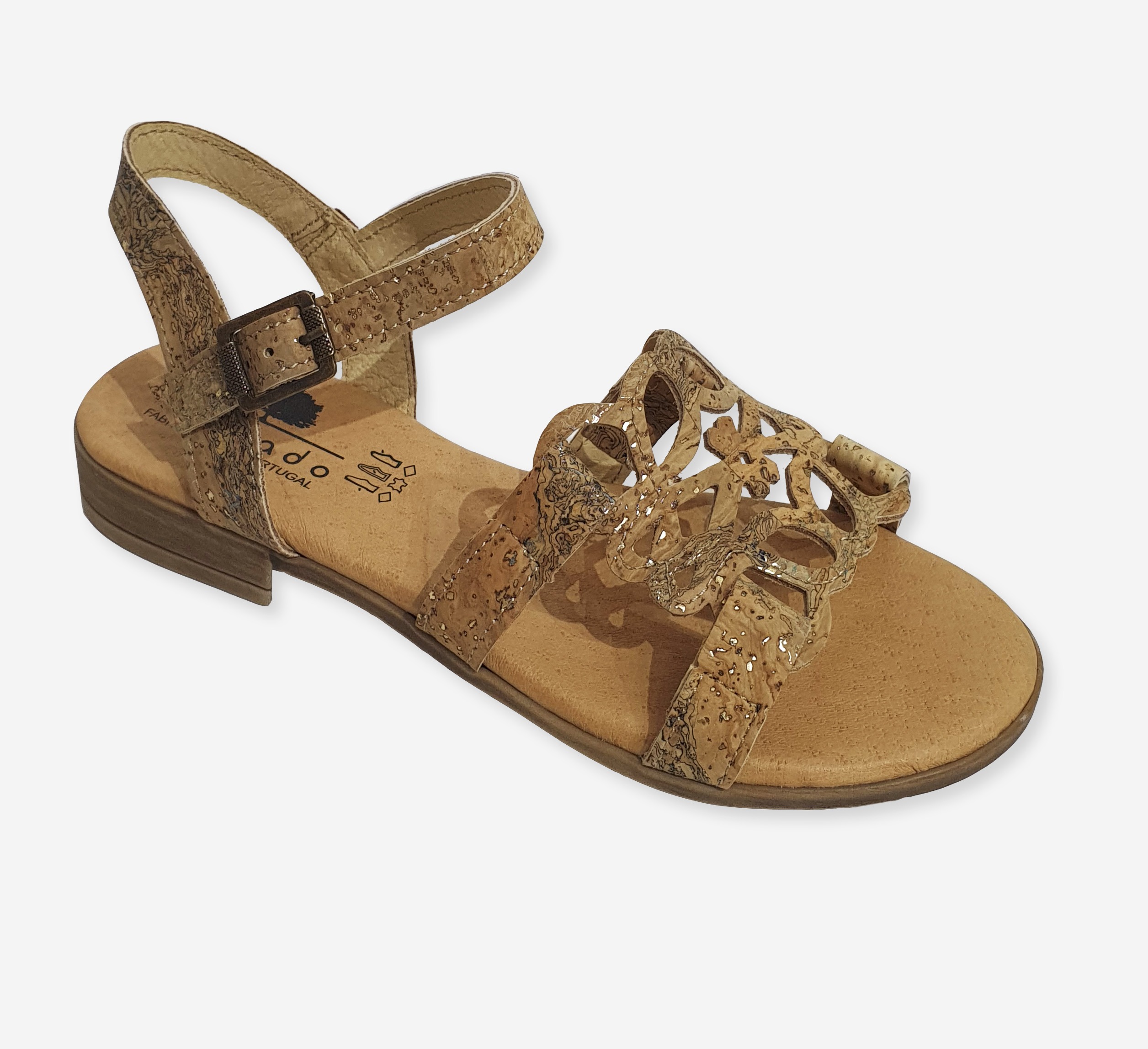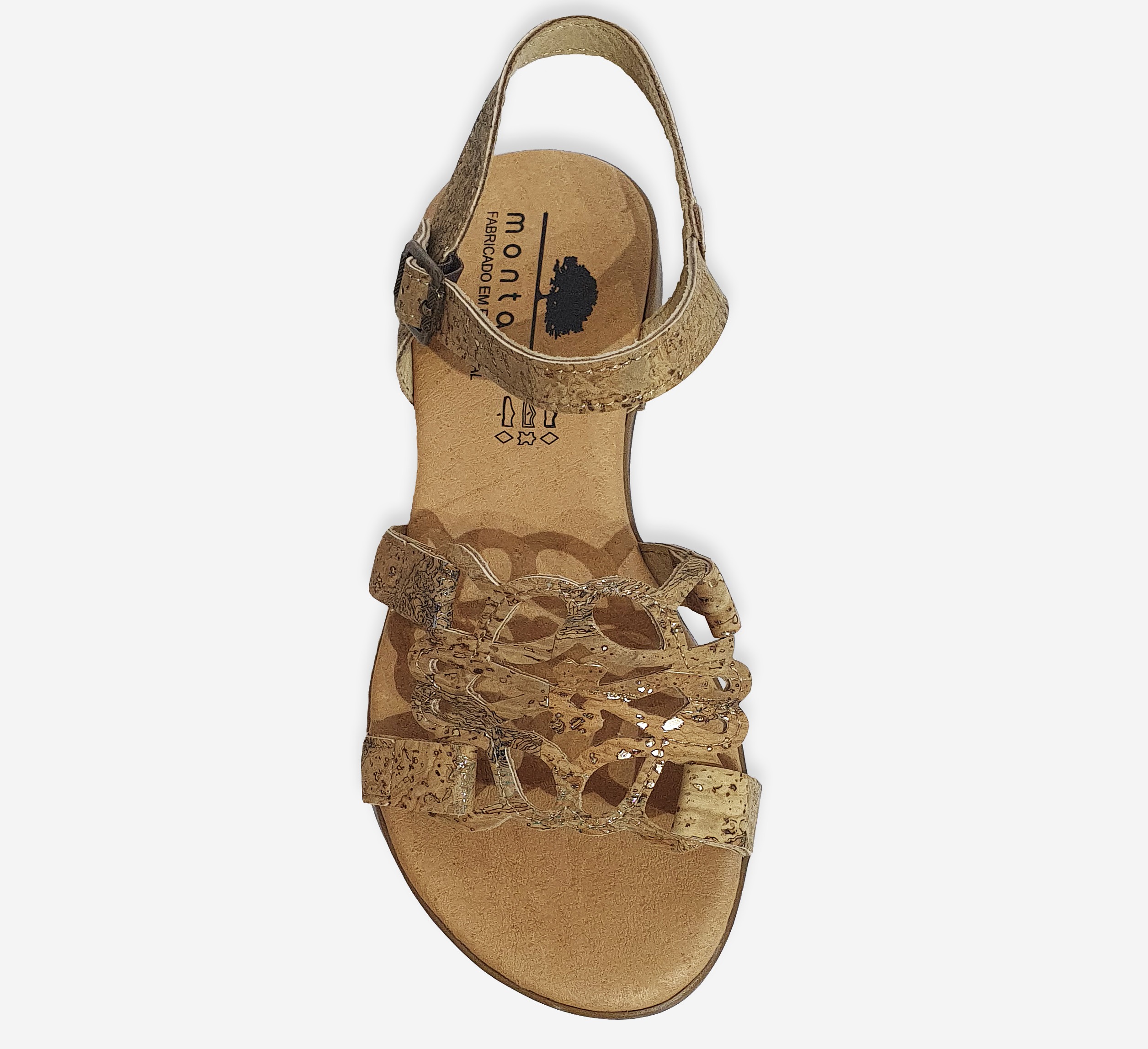 Delicate and graceful, these sandals feature a floral-patterned upper that mimics the look of a decorative strap. Made from shimmering golden cork and lined with soft leather, they combine elegance with all-day comfort. A metallic buckle secures the fit, while the flexible rubber sole keeps every step light and easy. A romantic touch for warm-weather looks.