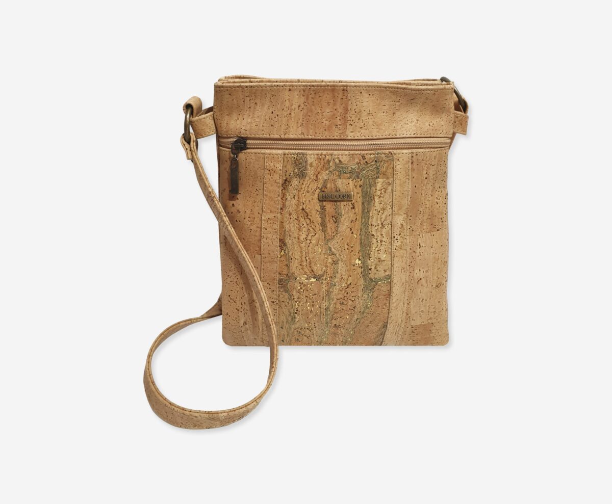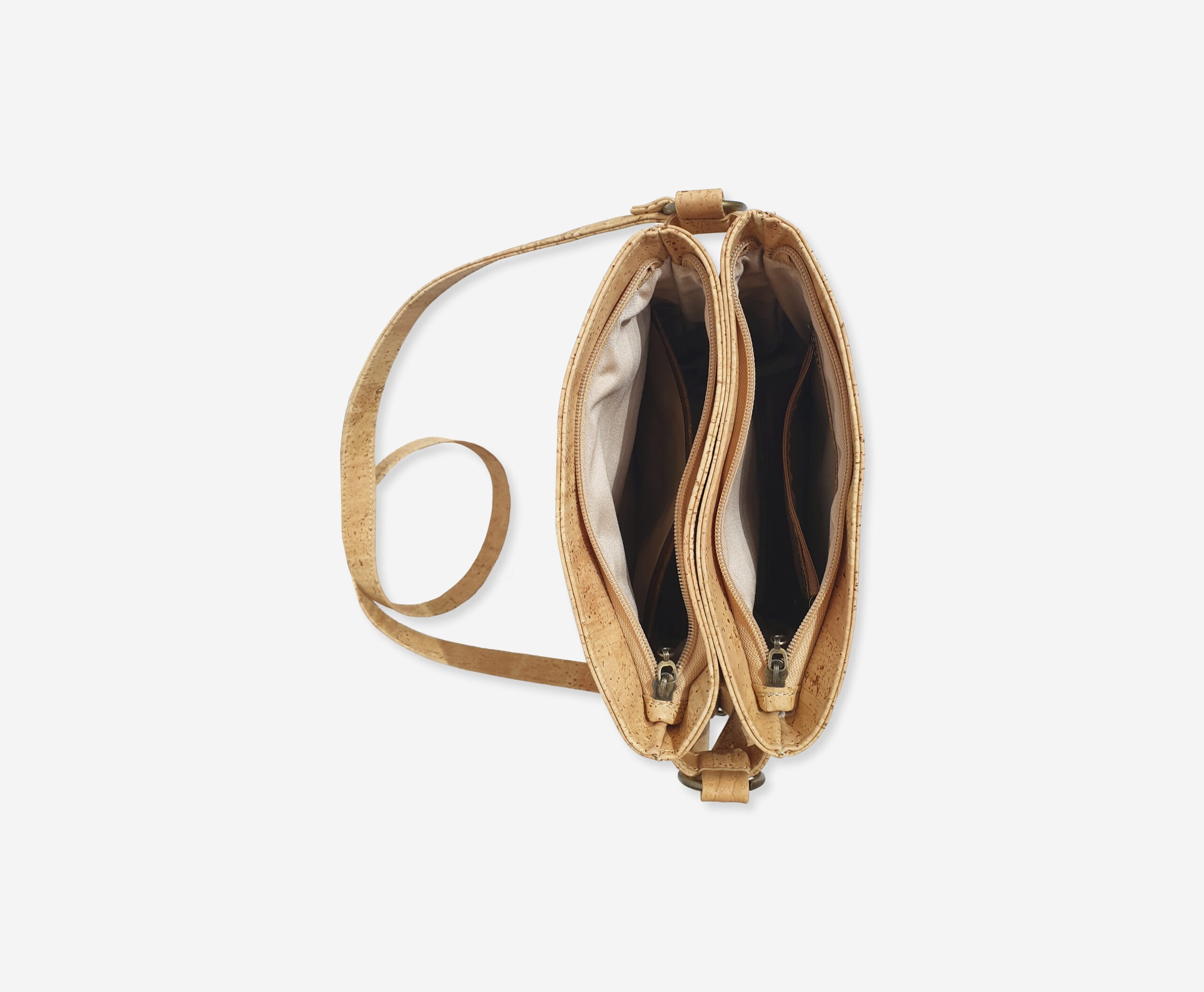 An elegant elongated bag with two main compartments, secured by a convenient zipper closure crafted from high-quality cork material, a perfect companion for stylish everyday ventures. This stylish accessory combines refined design with practicality. Perfect for organizing your belongings, the bag offers two compartments for easy separation of items. The zippers ensure a secure closure, providing safe storage for your valuables. With its sleek design and functionality.