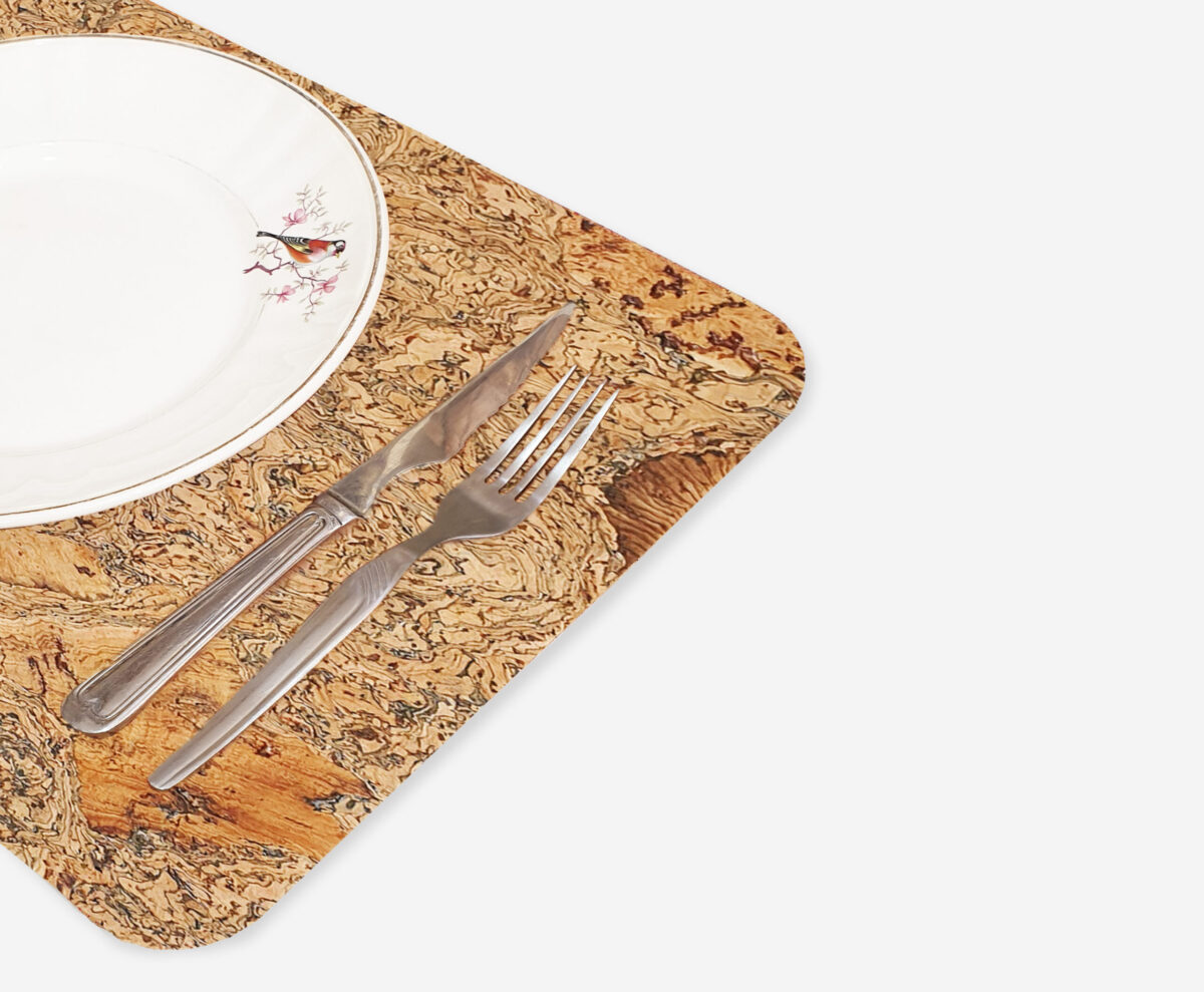 Set of Individual Cork Placemat on the table for 4 person are non-slip and heat resistant, and are also an excellent choice because they are: anti-allergic, anti-fungal, antibacterial, antistatic, fire resistant and 100% vegan.