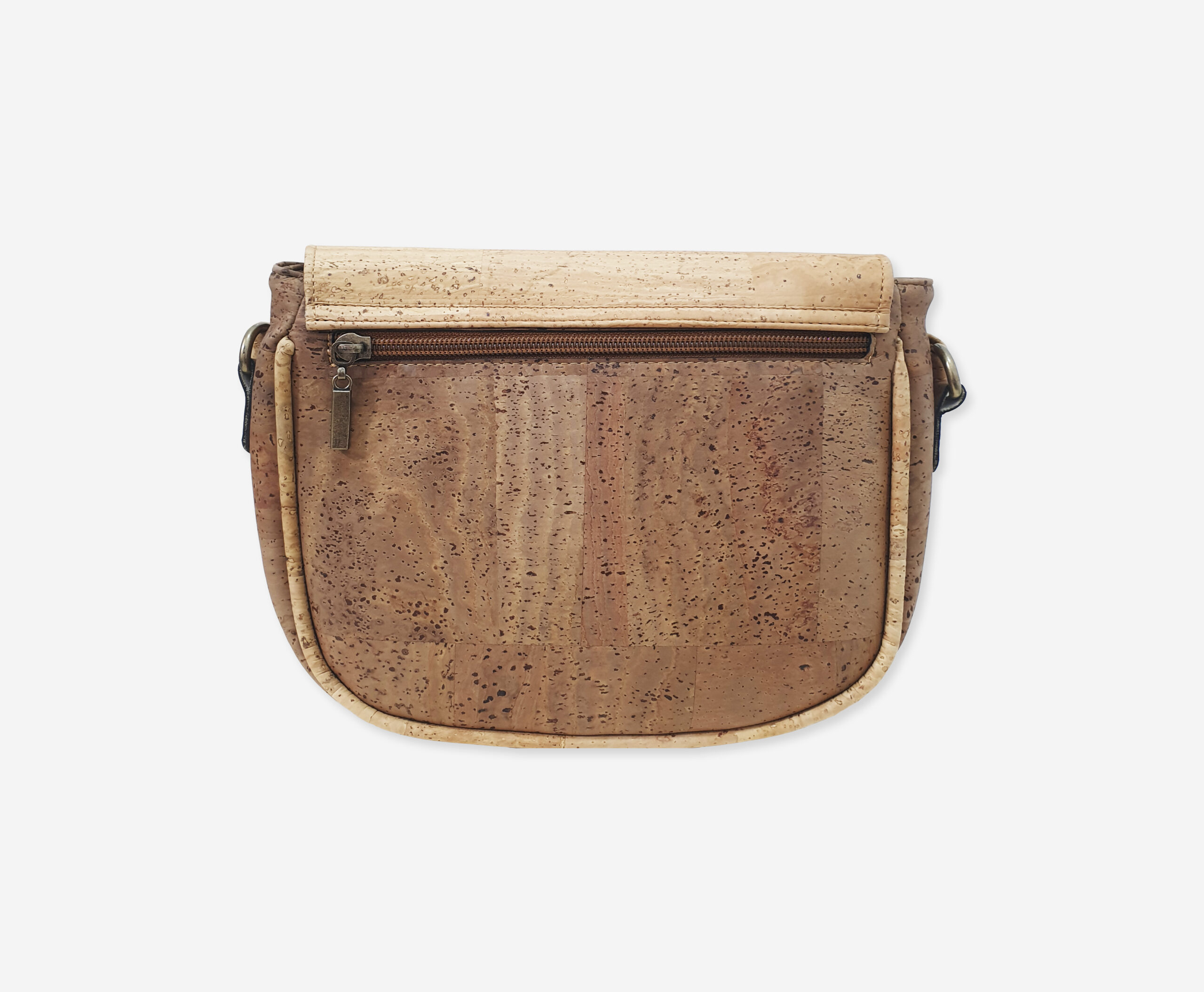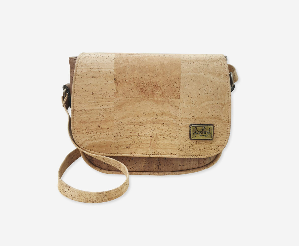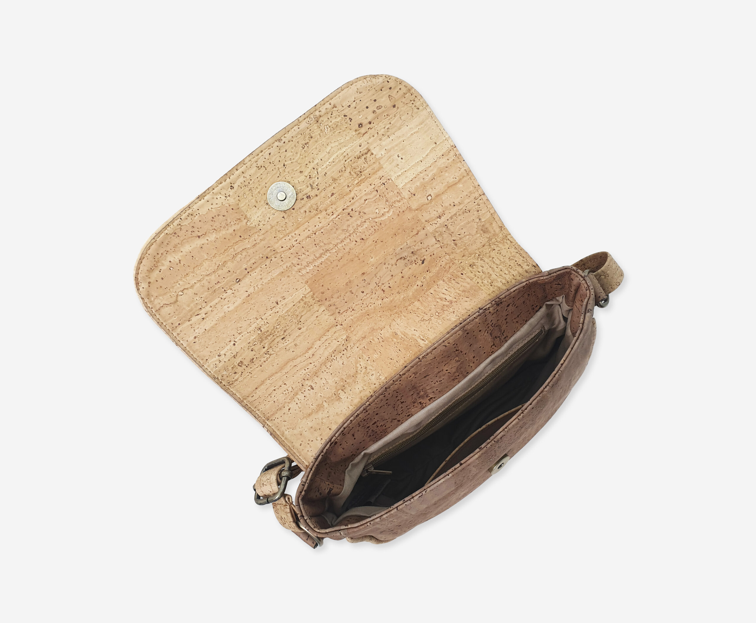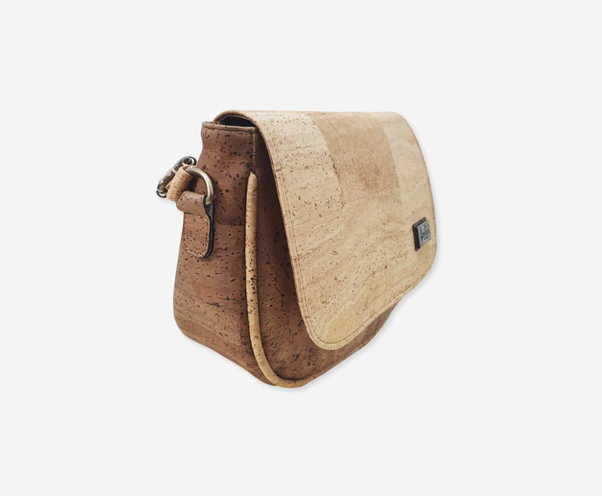Small Cork Crossbody Bag with high quality cork. The bag has a flap that closes with a magnet. There is a long adjustable shoulder strap and bag can be worn on the shoulder or over the shoulder. In front there is a our branded label.