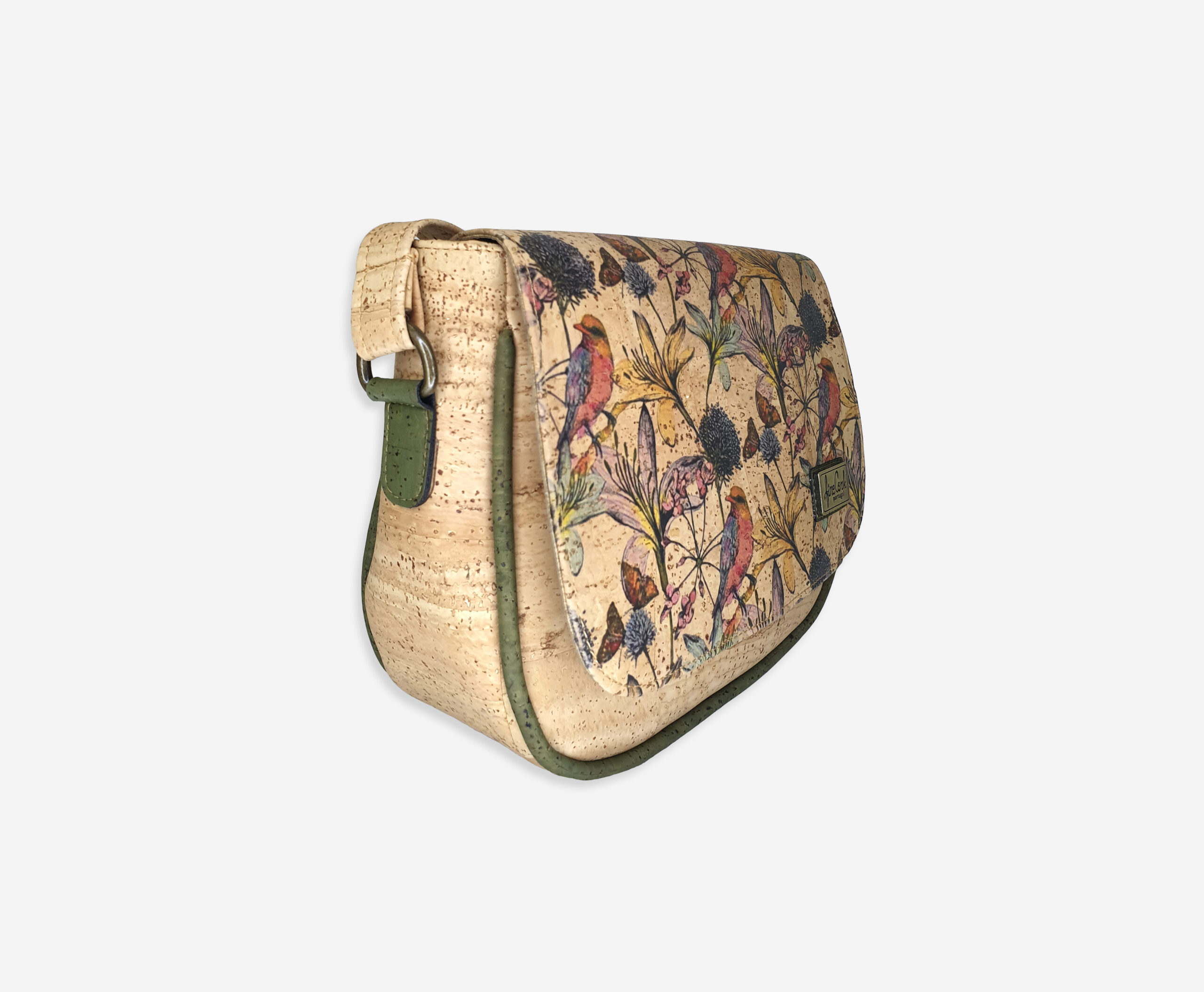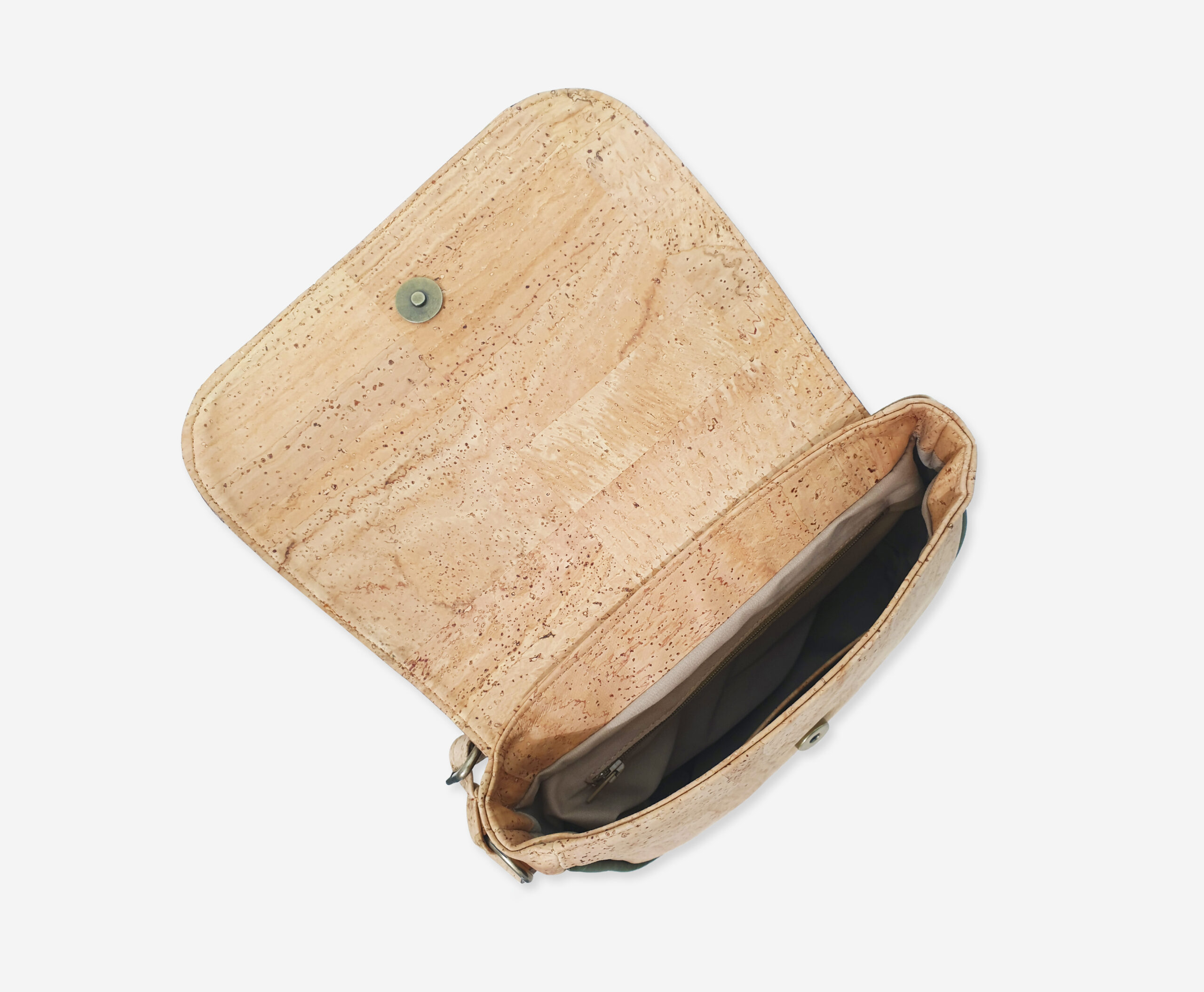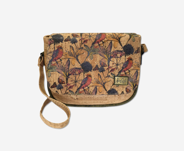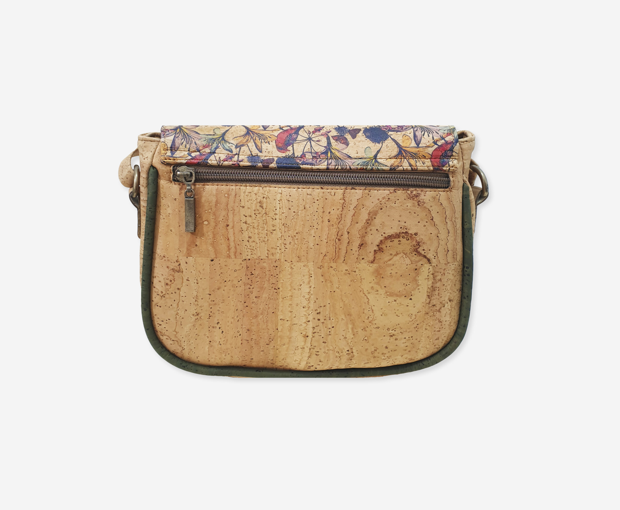 Small Cork Crossbody Bag with high quality cork and has decorative print on the cork. The bag has a flap that closes with a magnet. There is a long adjustable shoulder strap and bag can be worn on the shoulder or over the shoulder. In front there is a our branded label.