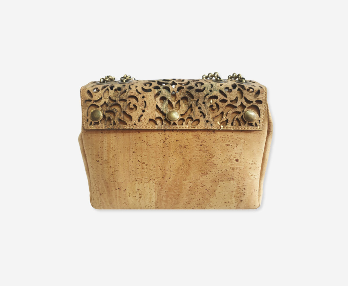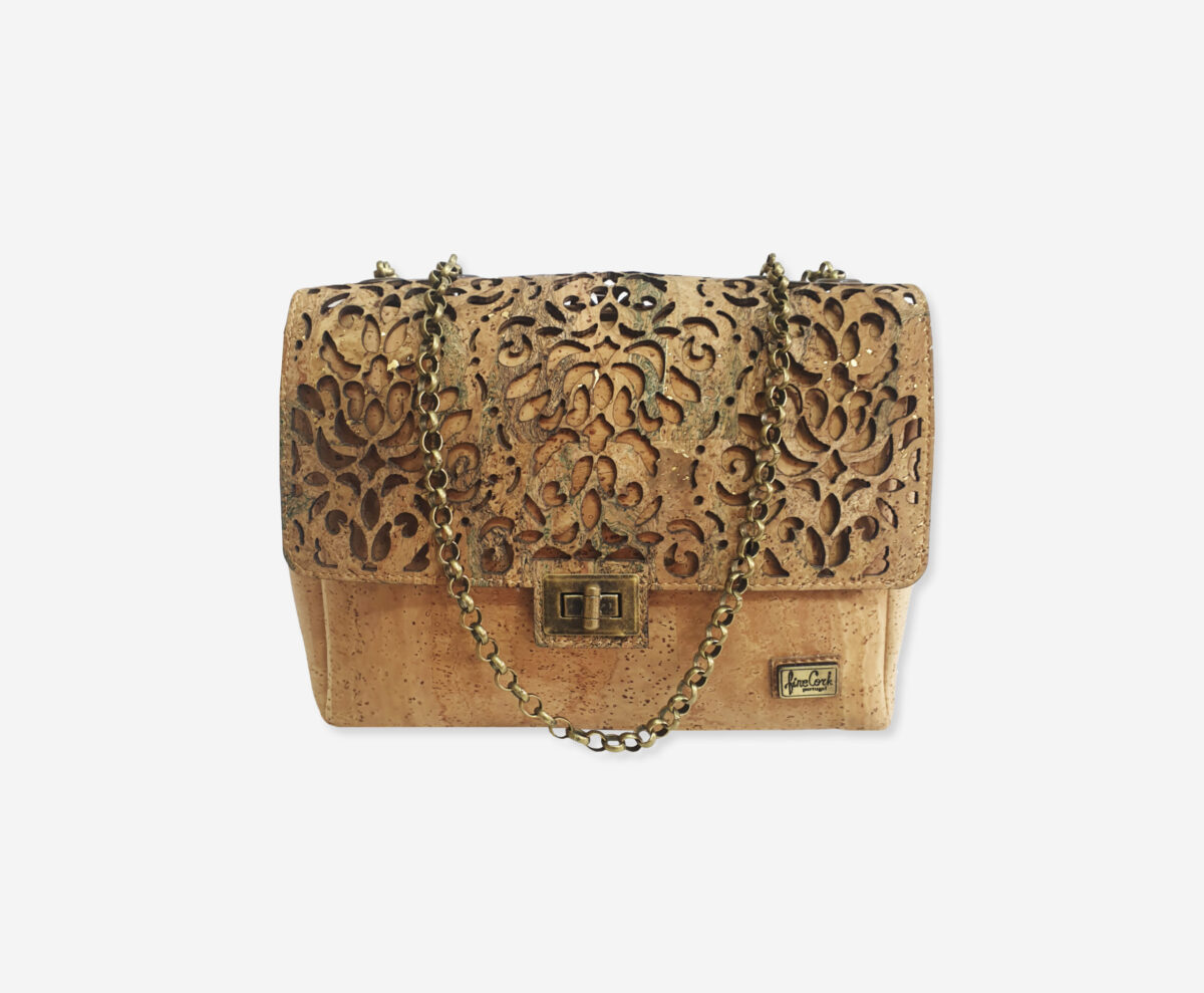 There is decorative pattern represents the famous portugues filigrin cut on cork. Bag there is a sliding chain strap, that can be worn multiple ways, changing between a shoulder and a top handle bag.