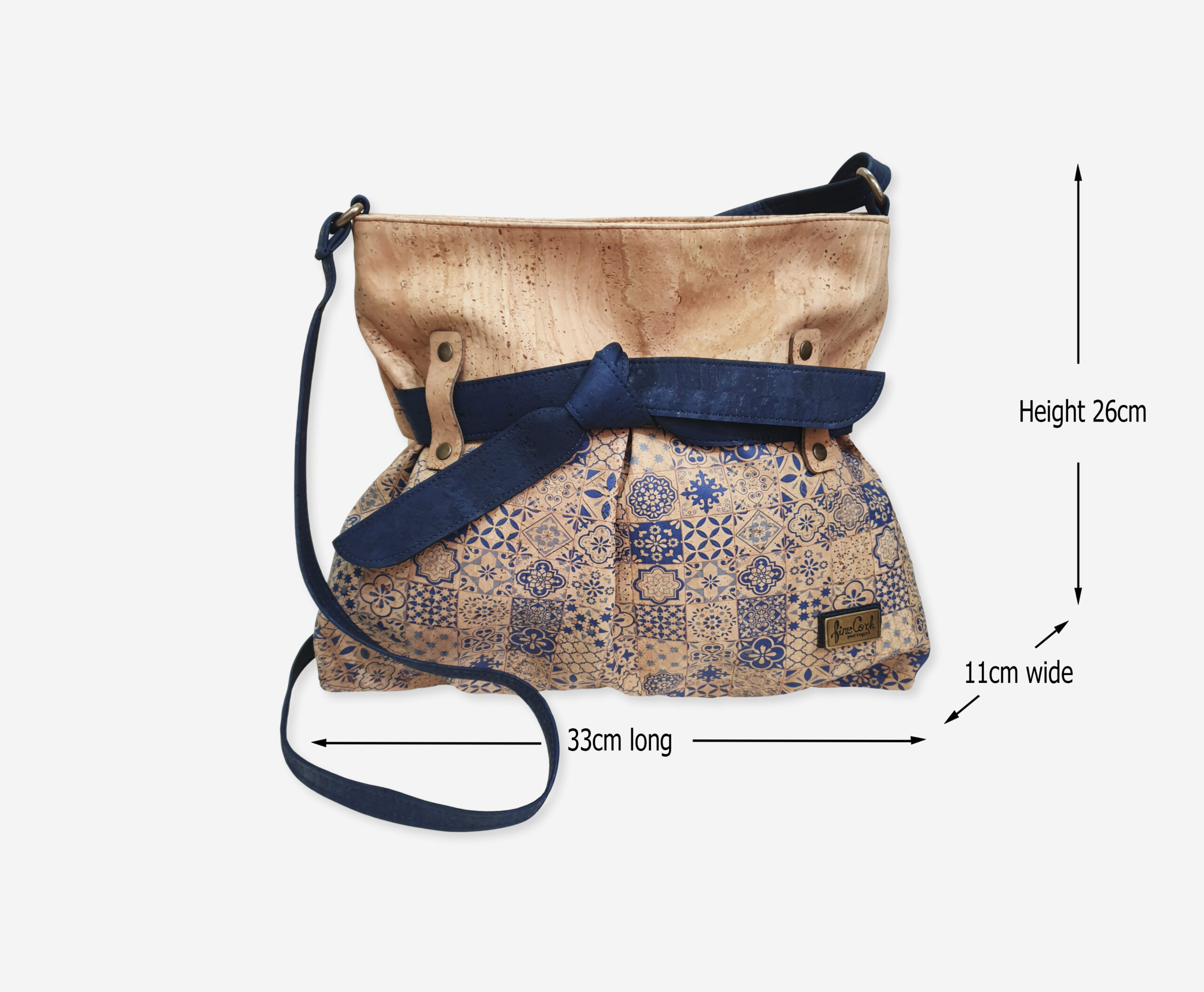 Stylish Shoulder Bag with high quality cork. There is have decorative bow the outside with blue cork. Bag has a long adjustable shoulder strap and can be worn on the shoulder or over the shoulder.