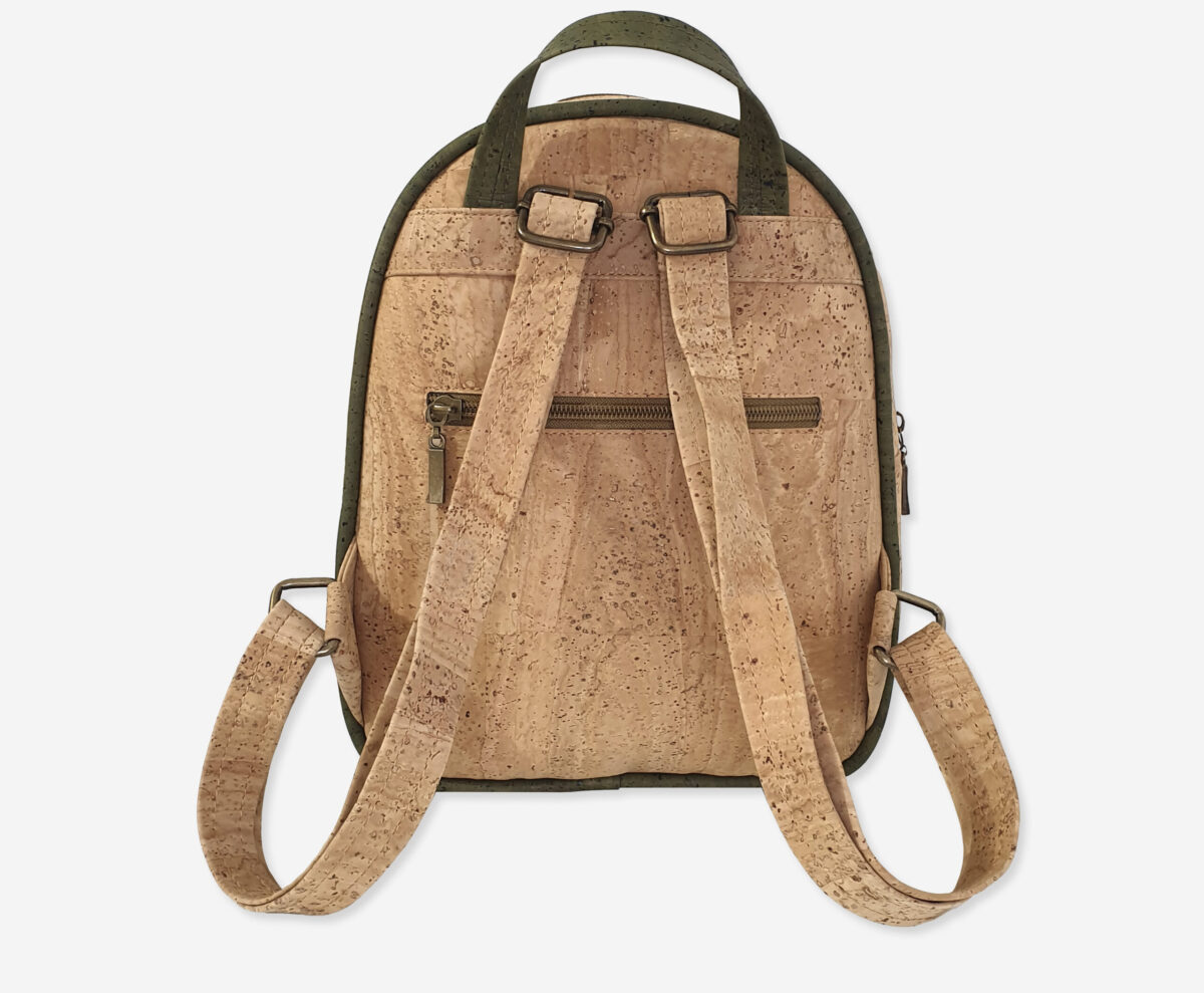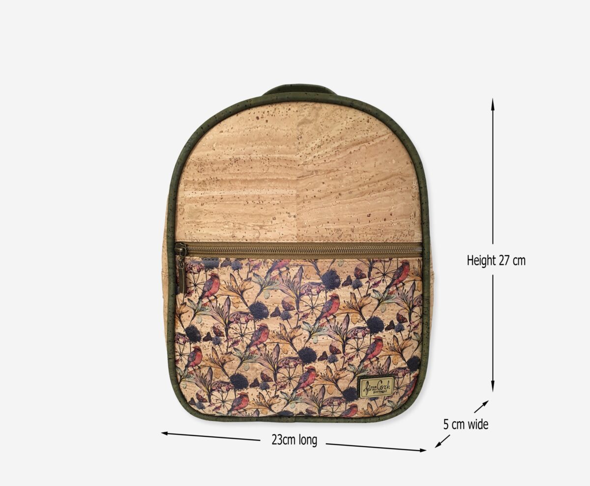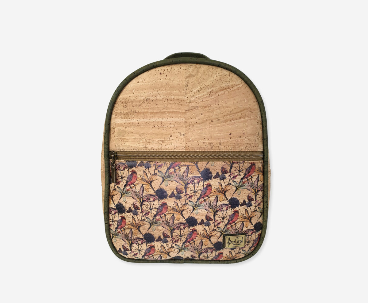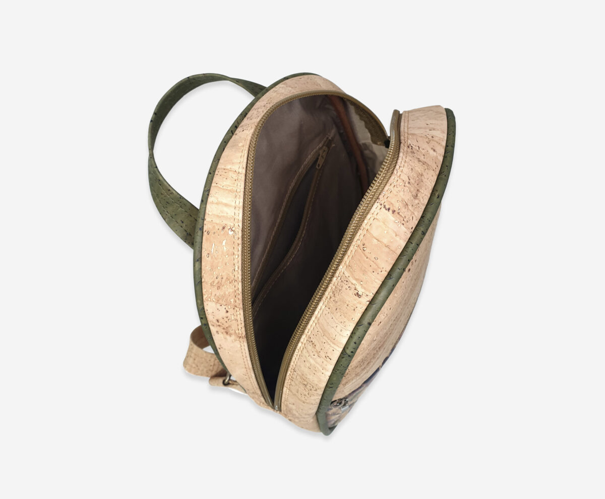Backpack made of genuine cork leather with print. The backpack has a one main zippered compartment and one front slip compartment with enough space for everything you need. It has a grip handle and padded cork shoulder straps for easy portability. Our branded label is on the front.