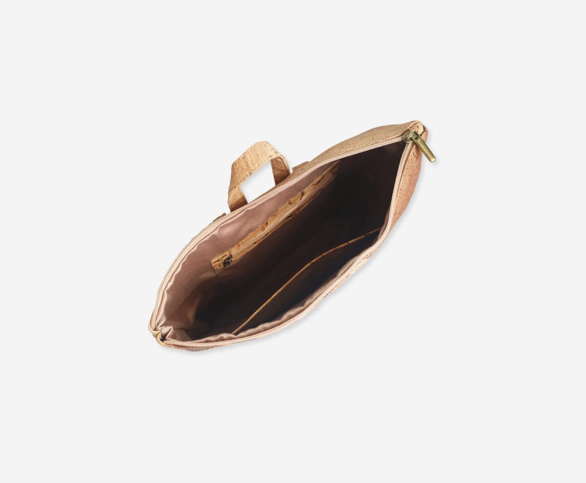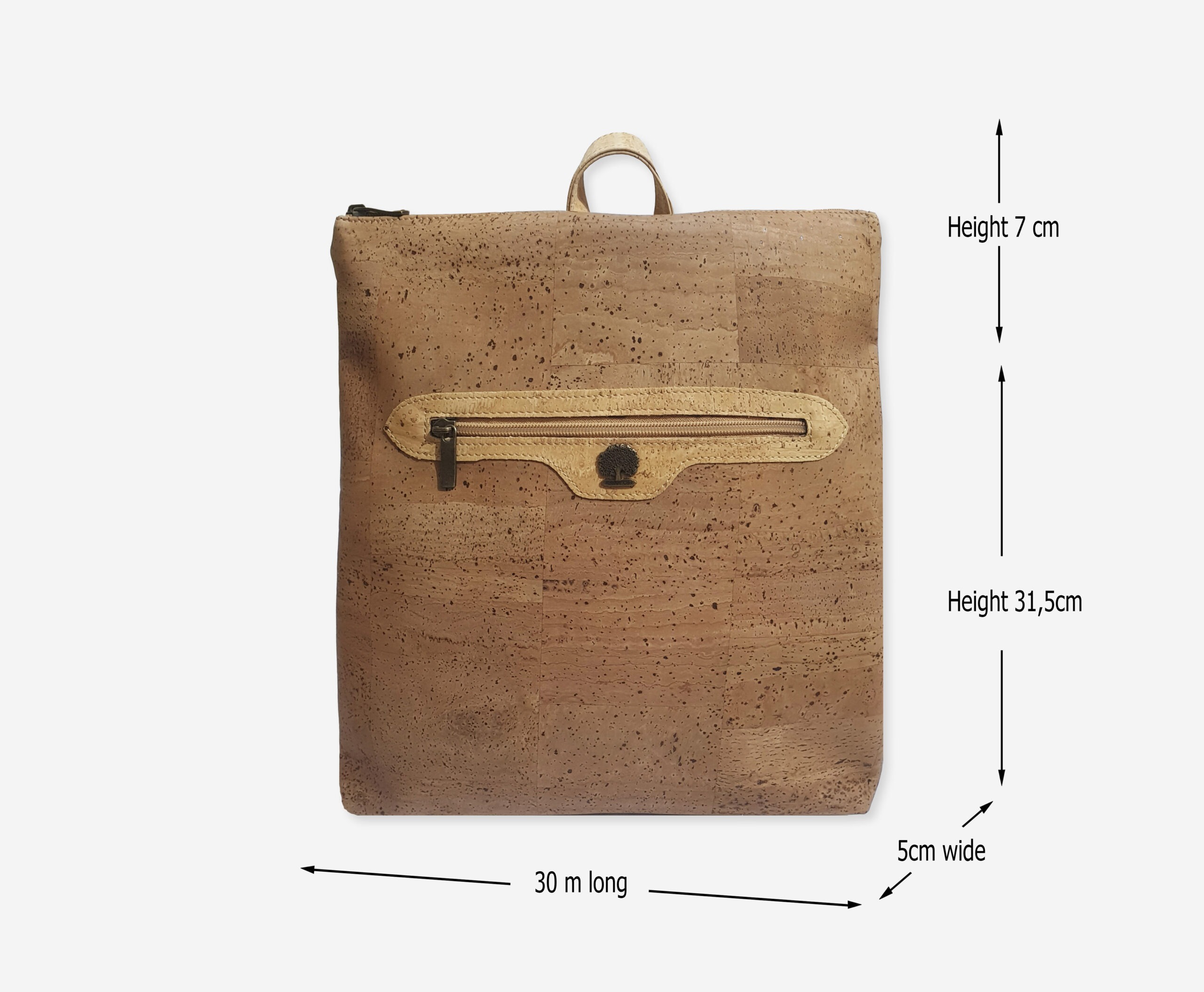 Backpack made of genuine cork leather. The backpack has a one main zippered compartment and one front slip compartment with enough space for everything you need. It has a grip handle and padded cork shoulder straps for easy portability. Our branded label is on the front.