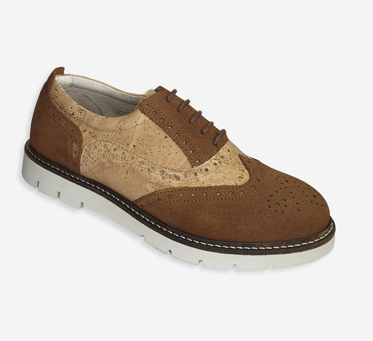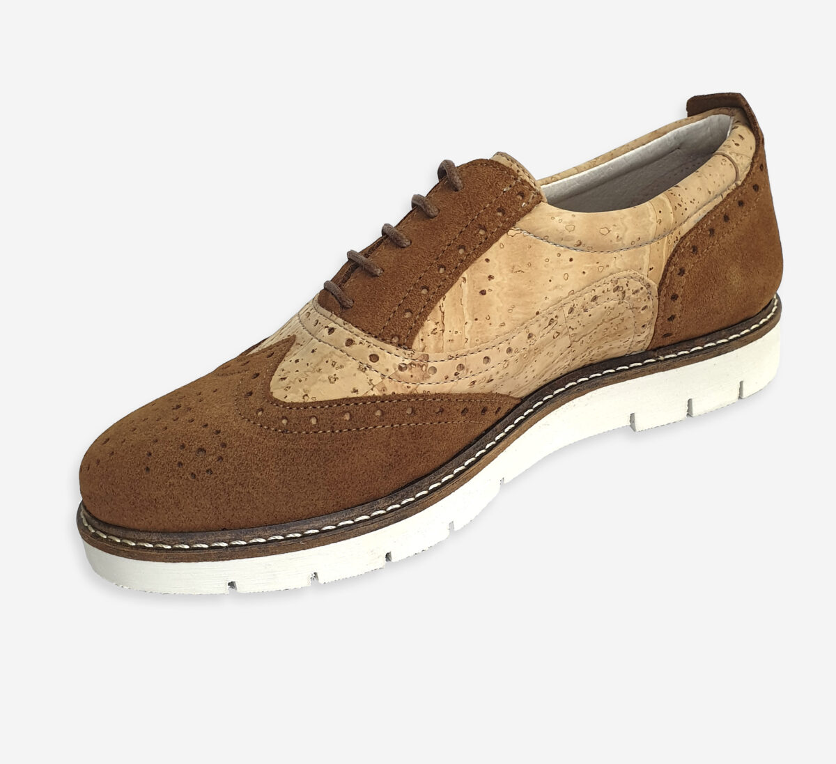 Women closed shoes with a natural cork upper, fully leather lining, and leather toe and heel caps. Lace-up design ensures a comfortable fit. Lightweight, breathable, and stylish — perfect for everyday and business wear