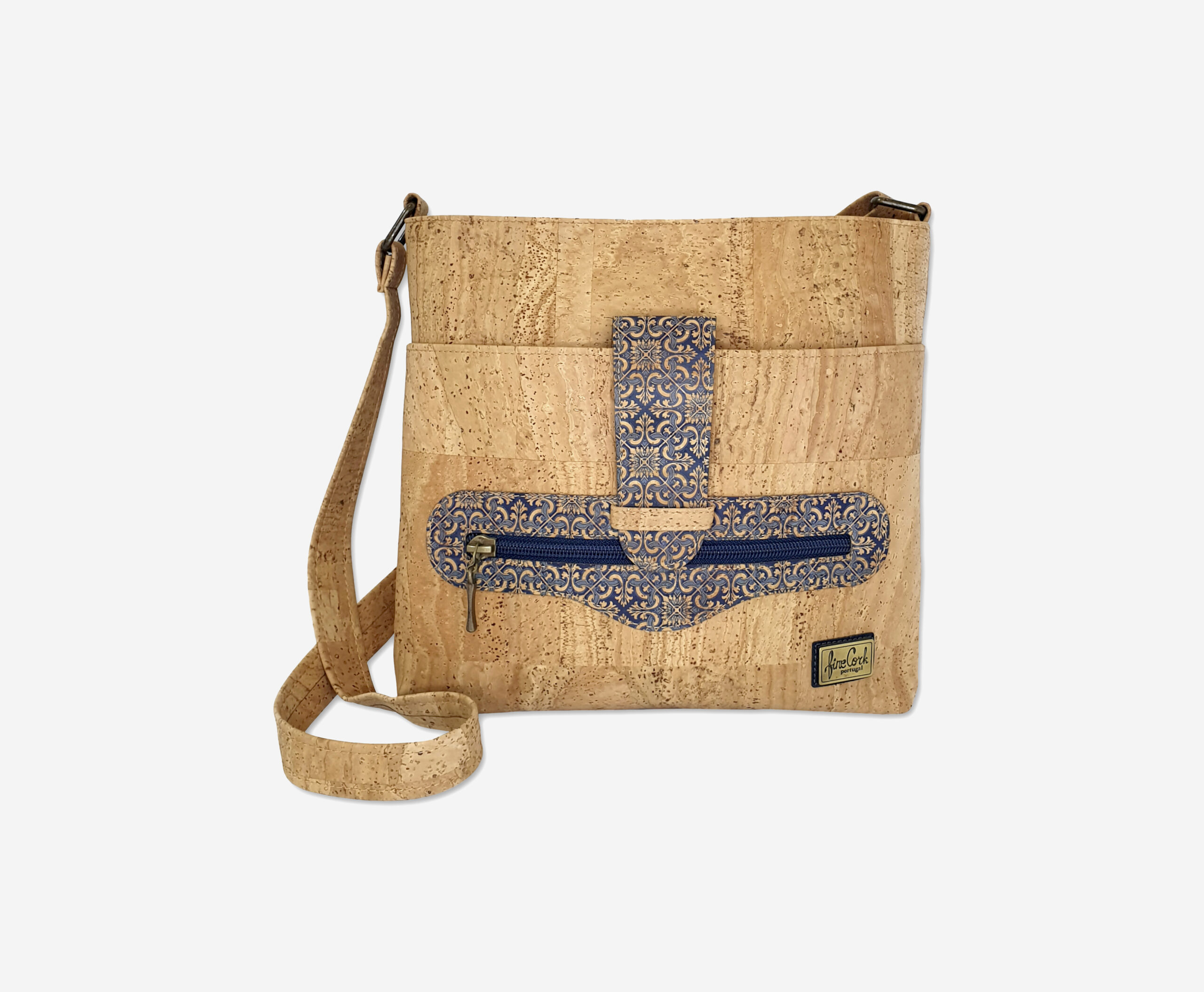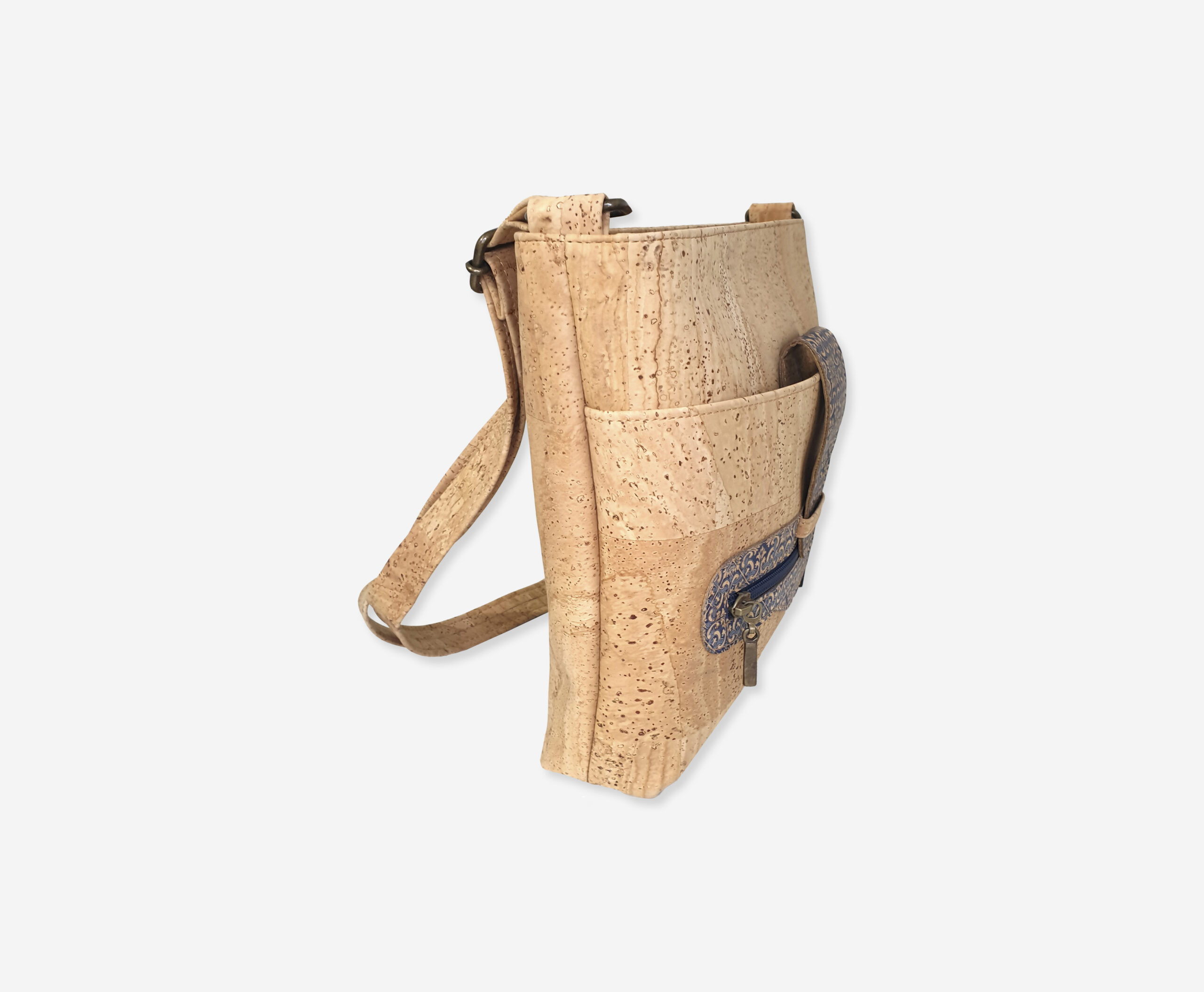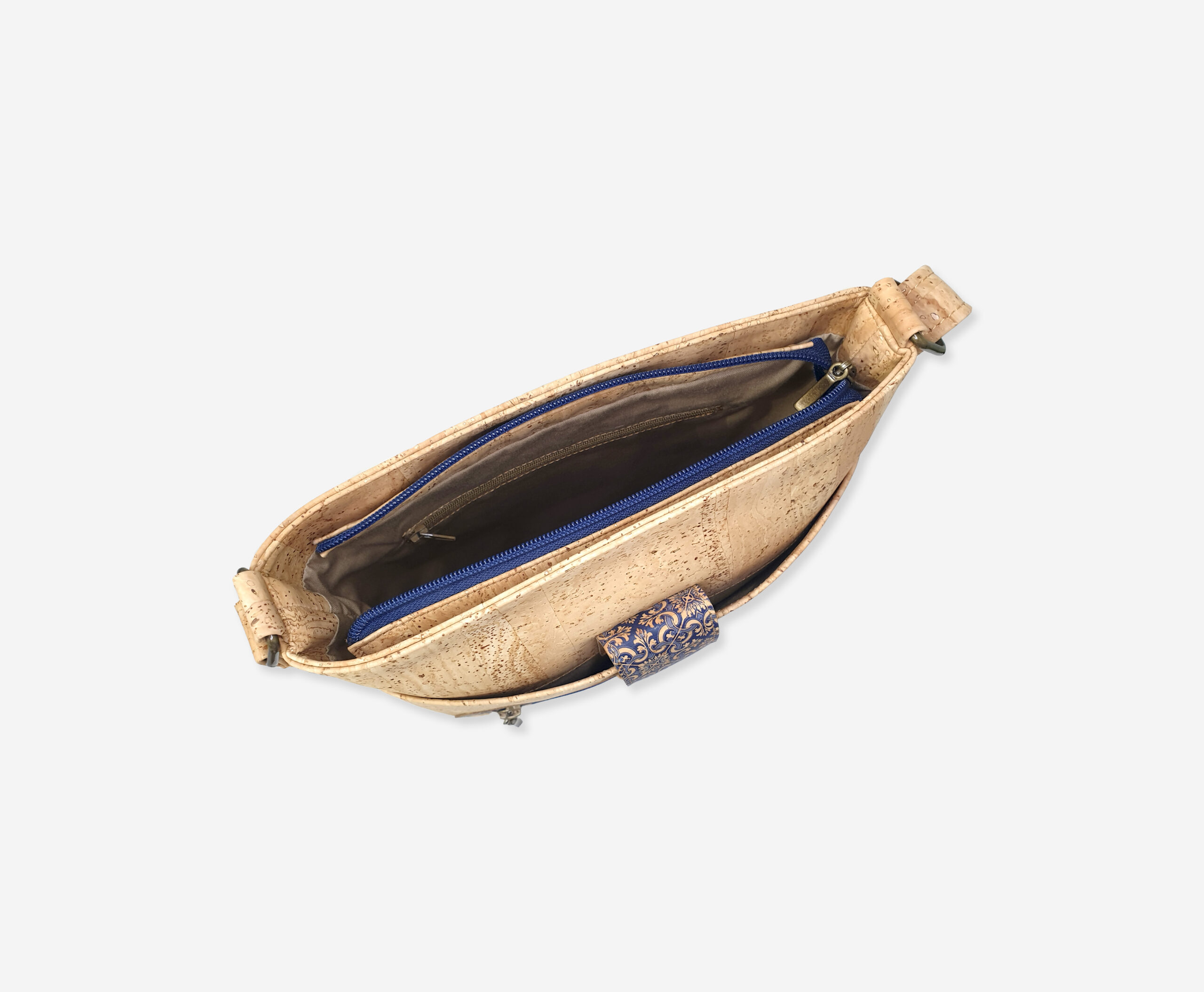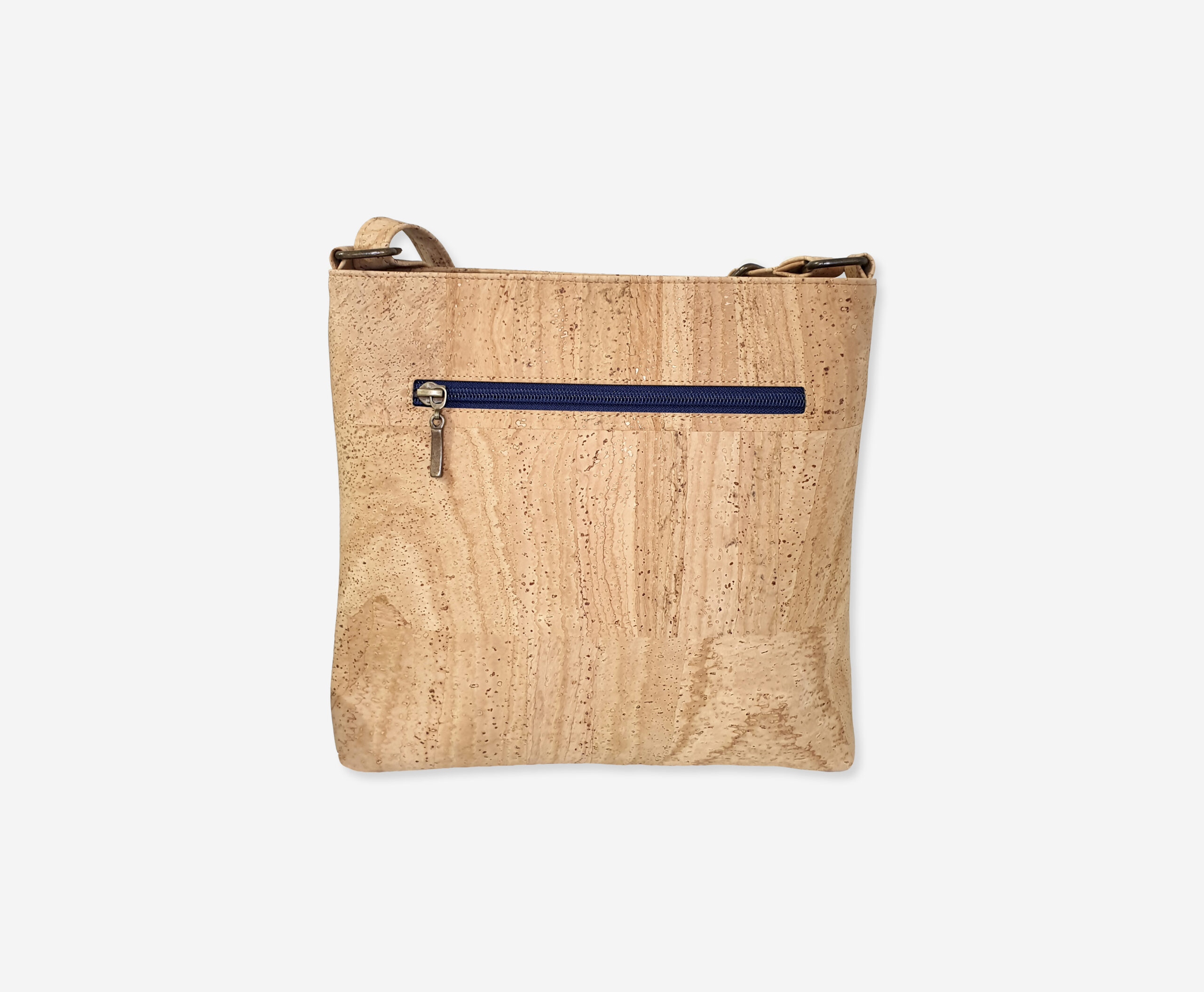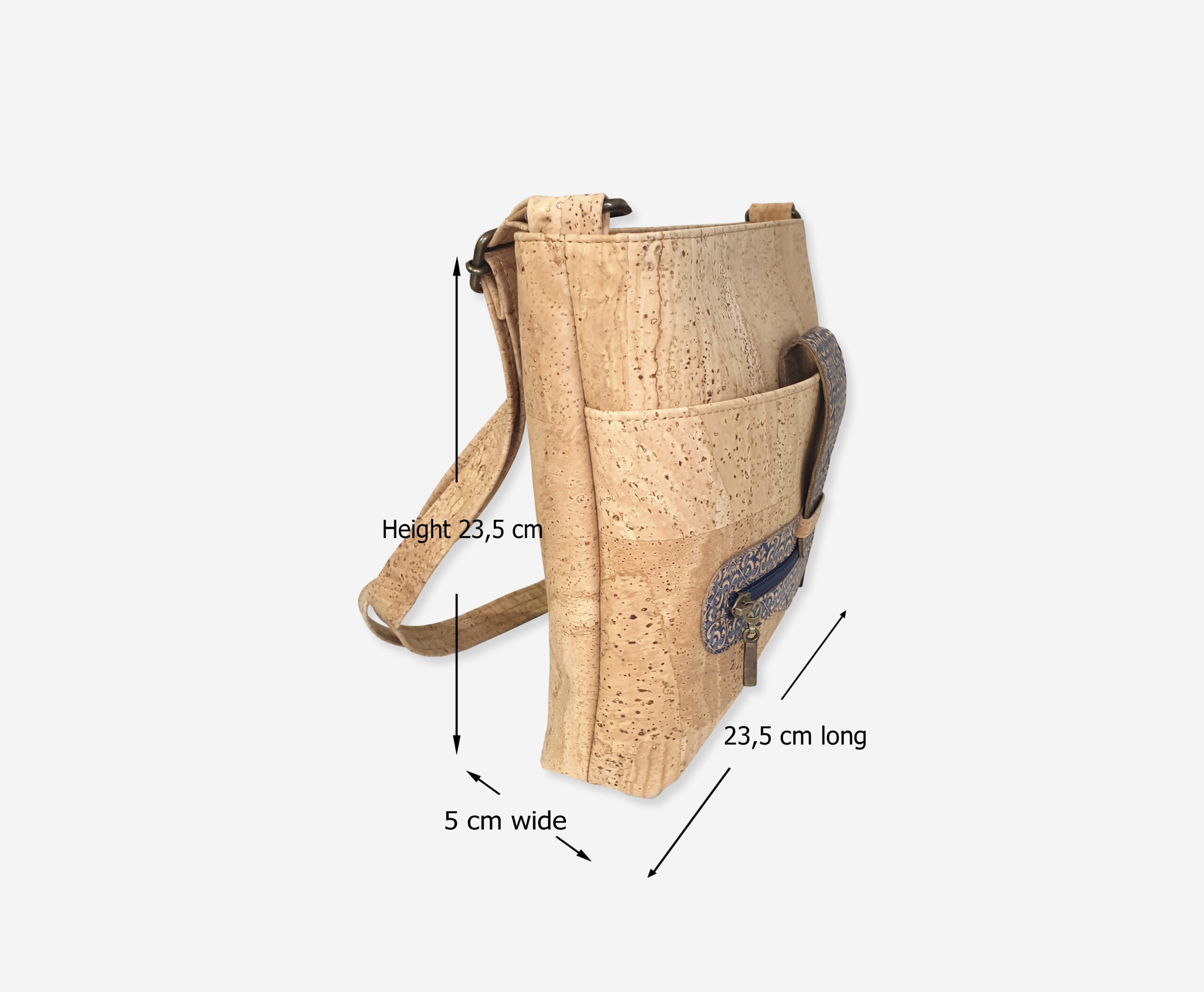 Vegan Cork Shoulder Bag with higth quality cork. The bag has a flap that closes with a zipper on the top and small pocket of the front closes with a decorative strap. The bag have a long adjustable shoulder strap and can be worn on the shoulder or over the shoulder. In front there is a our branded label.
