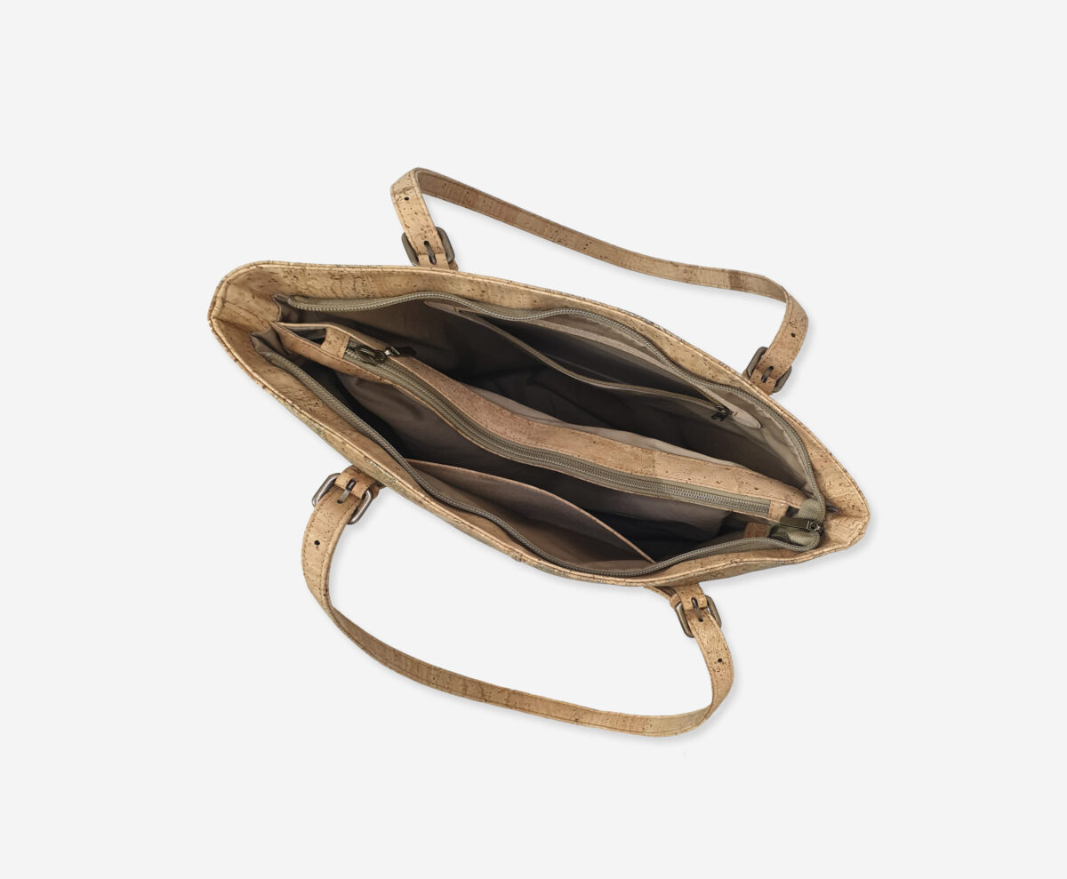Handbag with high quality cork has a softly structured shape and a zipper closure.The tote is big enough to keep 13″ laptop.There is protective metal feet. External zip pocket for phone or passport. The bag also heve 3 main compartment where you can put enough things there whenever you go out. Inside bag there is small zip pocket and pocket without zipper. In front there is a our branded label.