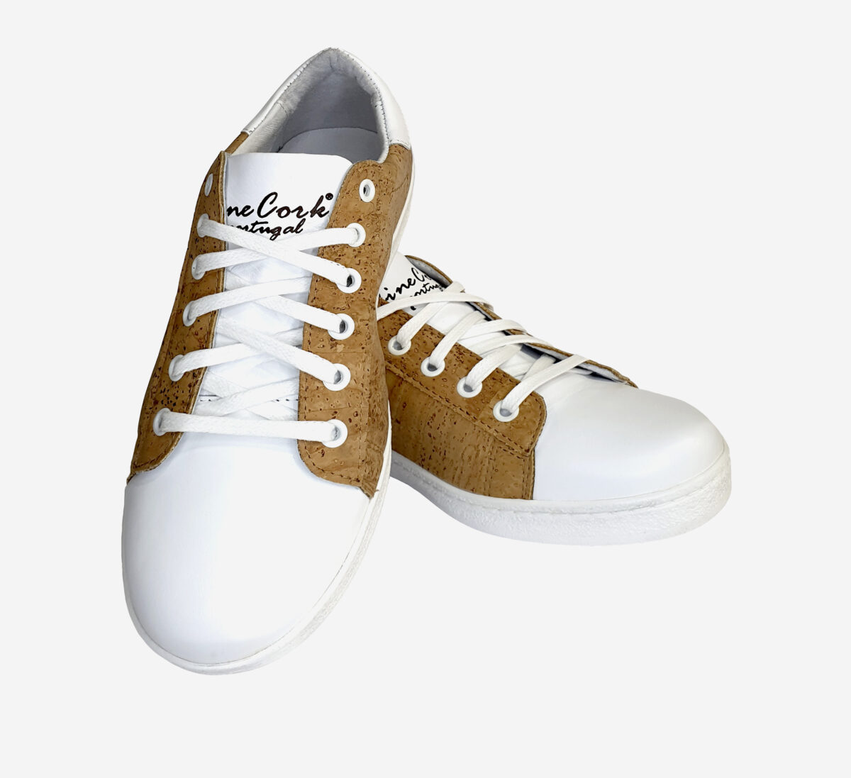 Popular white women’s sneakers, made in Portugal, made of cork and genuine leather in white.